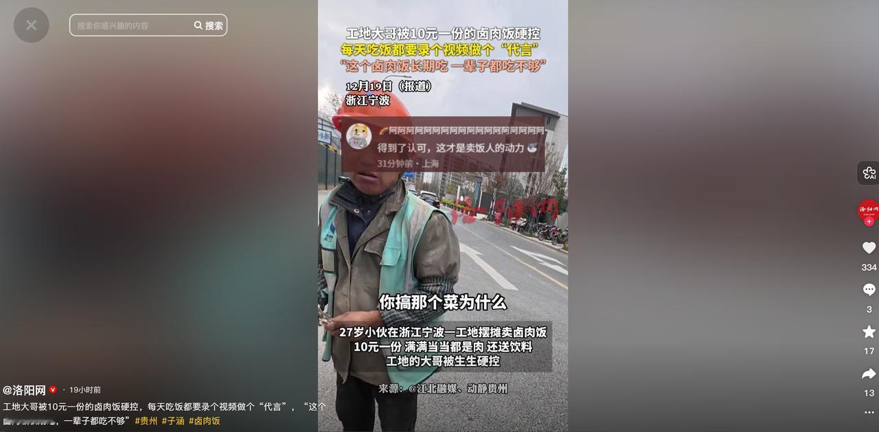 太有头脑了!浙江一27岁小伙为了挣钱,竟然跑到工地外卖卤肉饭,却只卖10块钱一份,里面不仅有肉,还有鸡蛋,甚至还送一瓶饮料,搞得工地大哥都不好意思了,每天吃饭都要录视频做“代言”:“这个卤肉饭长期吃,一辈子都吃不够!” 你要是路过他的摊位,一眼就能感受到这份饭的实在,烈日暴晒的工地边,小伙的小摊就支在角落里,来往的全是满身尘土、手上布满老茧的工友,每到饭点摊位前就排起了长队,大哥们拿着饭盒,眼神里全是期待,等拿到饭一看,好家伙那饭碗装得满满当当,米饭压得实实的都冒着尖,用勺子往里伸都得使劲。 最让人惊喜的是上面的卤肉,根本不是那种碎得看不见的肉末,全是炖得软烂入味的大块肉,色泽红亮,看着就流口水,肥的部分流油却不腻,瘦的部分吸满了卤汁一点都不柴,就这么厚厚地铺了一层,几乎盖满了整个碗面。 除了肉碗里还卧着一颗完整的卤蛋,外皮Q弹卤香十足,旁边再配上几筷子翠绿的青菜,解腻又提鲜,光看卖相就值回票价。 更让大哥们过意不去的是,每份饭还必送一瓶饮料,有时候是旺仔牛奶,有时候是其他饮品,都是实打实的瓶装饮料,不是那种廉价的散装饮品。 要知道现在外面随便一份外卖都要二三十块,肉片还藏在配菜里玩“躲猫猫”,对比下来小伙这10块钱的卤肉饭,简直是“业界良心”,有大哥就说本来干活累,就想找份饱饭吃,没想到不仅吃得饱,还能喝到饮料,总觉得占了小伙的便宜,都有点不好意思来买了。 明眼人都能看出来,这生意做得有多“亏”,有较真的人私下帮小伙算过账,按现在的市价,新鲜猪肉就算拿批发价,一斤成本也得三块多,光碗里那层卤肉就值不少钱,再加上满满一碗米饭、五毛钱一颗的卤蛋、五毛钱一份的青菜,这食材成本就快五块了。 更别说那瓶饮料,就算大批量进货,一瓶成本也得四块左右,这还没算煤气费、一次性餐盒的损耗,以及小伙自己起早贪黑的人工成本。 这么算下来一份饭的硬成本就快九块了卖10块钱,利润薄得像张纸,周围不少人都看不懂,觉得小伙是在用真金白银赚吆喝,甚至有人说他“傻”,可只有工地上的大哥们知道,小伙这不是傻,是真懂他们的难处,这份实在里藏着大智慧。 小伙每次盛饭的时候,手不停嘴也不闲着,递过饭和饮料的同时,总会顺口问一句:“今天活儿重不重?累不累?”没等大哥们回答,又会补一句实在话:“米饭管够啊,吃不饱千万别客气,直接喊我给你添。” 就这简单的两句话,却戳中了工友们的心窝子,他们干的都是最耗体力的活,平时为了多给家里寄点钱,在吃上从来都舍不得讲究,经常是凑活一顿算一顿,肚子里缺油水心里也缺份温暖。 突然碰到这么一个不玩套路、不克扣分量,还愿意关心他们的摊主,大哥们的感动都写在脸上,他们不知道怎么报答这份实在,就用最笨拙也最真诚的方式回应。 不少大哥接过饭碗,还没动筷子就先掏出手机录视频,背景就是嘈杂的工地,对着镜头大声说:“你们看,这就是实在人卖的实在饭!10块钱一份,有肉有蛋还有饮料,味道好得很,这种卤肉饭这辈子都吃不够!” 这些带着浓重乡音的“代言”,没有华丽的剪辑,也没有精致的文案,却比任何网红探店都有说服力,很快小伙的摊位就在工地上出了名,不光是本工地的大哥们来吃,附近工地上的工友也会特意跑过来,就为了吃一份实在的卤肉饭,每到饭点他的摊位前总是最热闹的,回头客一波接一波,大家都有一种默契,哪怕不缺这10块钱,冲着这份良心也得天天来捧场。 其实小伙的生意经一点都不复杂,甚至违背了很多人“算计成本、压缩分量”的商业逻辑,但他却摸透了底层劳动者的需求,在这个大家都忙着逐利的时代,他用真心换真心,用实惠换口碑,对工友们来说,这碗饭不仅填饱了肚子,更给了他们一份尊重和温暖,对小伙来说虽然单笔利润不高,但稳定的客流和良好的口碑,让生意越做越稳。 不得不说小伙是真有头脑,他知道做生意不光是为了赚钱,更要懂得人心,那些送出去的饮料,甜的不只是工友们的嘴巴,更是他们为生活奔波疲惫的心,那些暖心的问候,拉近的不只是摊主和顾客的距离,更是人与人之间的信任。 现在越来越多的人知道了这个工地边的小摊,有人说要向小伙学习,也有人特意赶来打卡,而小伙依旧每天守在摊位前,用心做好每一份卤肉饭,递好每一瓶饮料,用最实在的方式,书写着属于自己的创业故事。 (信息来源:洛阳网)