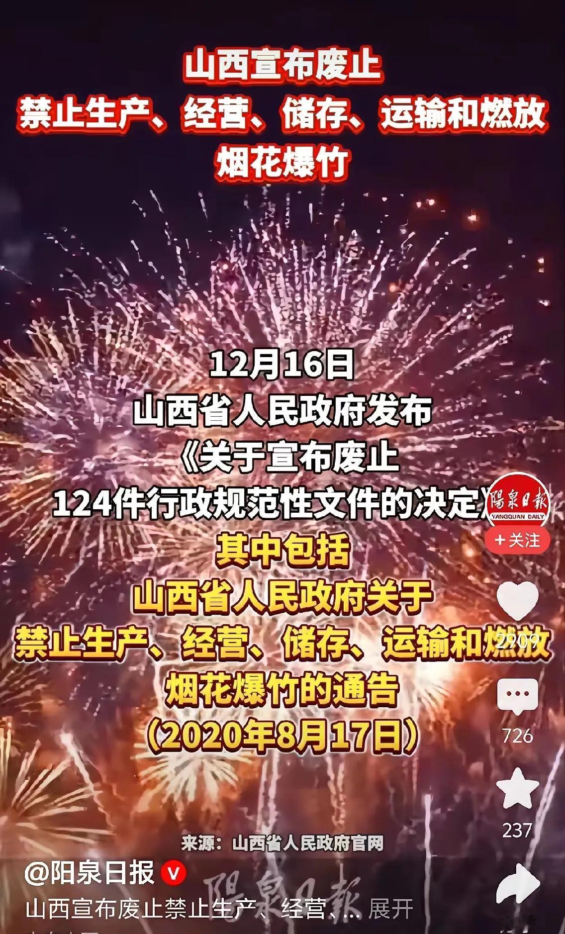 没有想到,山西省竟然出台过这样的禁止性文件,合省范围之内居然听不到一点鞭炮声,这种状况实在是让人难以想象。 放鞭炮是中国的传统习俗,已经延续了上千年时间。山西省这种一刀切全部管死的做法,实在是有些过分。也不知道当地人老百姓有没有对此进行过明确反对。 现在当地终于把这个禁止性法规给废除了,这是一件好事。 有网友评论说,当初山西省这样做是为了保护人民群众的生命安全,实际上,每年死于车祸的人数不知道是死于燃放烟花爆竹人数的多少倍!但是能把车辆取缔了吗?显然不能。 话说的难听一点,一个连鞭炮都不准放的国家和民族,如果有朝一日发生战争,老百姓还不得被炮声给吓死?