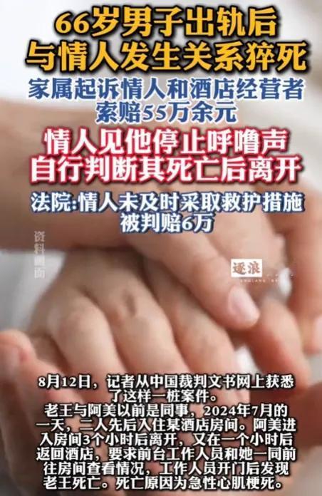 广西,66岁男子约情人在酒店见面,俩人发生关系后休息,情人睡醒,发现身旁男子没了动静,喊也没回应,判断男子已经没气了,匆忙离开酒店,一个多小时后,女子又返回,还带着工作人员查看男子的情况,此时男子已离世多时。事后,男子的家属把女子告上法庭,索赔55万,女子辩称自己当时没睡醒,不知道男子的情况,回家是为吃降压的药。最终法院判了。 (来源:裁判文书网,逐浪新闻、潇湘晨报) 南宁的傍晚,街头广场舞的音乐像潮水一样一波接一波,节奏热闹得让人忍不住跟着扭动身体。然而,就在这喧闹的背景下,66岁的王某却永远地消失了。 他最后被看到的地方,是泸沽湖附近一家酒店的房间——房间里没有监控,酒店也不在第一时间通知家人。这本来只是一次情感慰藉的私下约会,却意外成了他生命的终点,而那一刻的孤独,令人心碎。 回到2024年7月14日傍晚,广场舞结束后,王某没有像往常一样回家,而是跟相识两年的舞伴刘某去了附近的酒店。两人的关系在外人眼里一直保持低调:王某有瘫痪在床的老伴,而刘某自觉在家庭里缺少关注,两颗孤独的心在广场舞的节拍里碰在了一起。然而,王某身体里潜伏的高血压三级,却无情地存在着,并不会因为激情或心理慰藉而停歇。 在酒店房间里,他们进行了亲密行为。王某事后把腿搭在沙发上,说这样能缓解头晕,随即沉沉睡去。刘某躺在旁边的床上,没有意识到这沉重的鼾声已经不是普通的熟睡,而是心脏病发作的警告。不一会儿,房间里的声音戛然而止,寂静像石头一样压下来。 等刘某意识到异样,王某已经面色发青,嘴唇泛着青紫,腿上出现斑块,手腕的脉搏消失了。 面对这一突如其来的情况,刘某瞬间慌了神。 她可以选择立即拨打120求救,但恐惧彻底压倒了理智。她甚至没有尝试叫醒、搬动或检查王某,而是抱着慌乱的心理收拾东西,独自跑回家。 她在法庭上解释称自己有高血压,需要先回家服药,这样能冷静处理,但这一个小时的延误,让王某失去了最关键的抢救时间。等她重新带人赶回房间时,医护人员能做的也只是确认王某死于急性心肌梗死。 王某的离世,让他的家人陷入深深的悲痛与愤怒。妻子和孩子不仅为背叛而愤怒,更因刘某明知其高血压严重、依旧进行亲密行为并在危急时刻逃离而感到愤懑,认为这直接造成了王某的死亡。他们将刘某告上法庭,索赔55万元。 法院判定,王某作为成年人,清楚自己有高血压病史,对自己的身体负主要责任;但刘某作为唯一在场的人,具备救助义务,却未能采取任何有效措施,因此判定其承担10%的次要责任,需赔偿约8.7万元。 这起事件不仅仅是婚外情的悲剧,更是一次血淋淋的法律教育。它提醒大家,无论关系多亲密,当生命危急时,每个人都负有救助责任。 恐惧或借口都不能成为逃避行为的理由,多拨一次电话、多呼喊一次救援,可能就是生死的差别。 广场舞的旋律依旧在南宁的傍晚回荡,而王某的悲剧则像一面镜子,提醒每一个人,生命面前,没有轻松退路,任何疏忽都有可能付出沉重代价。