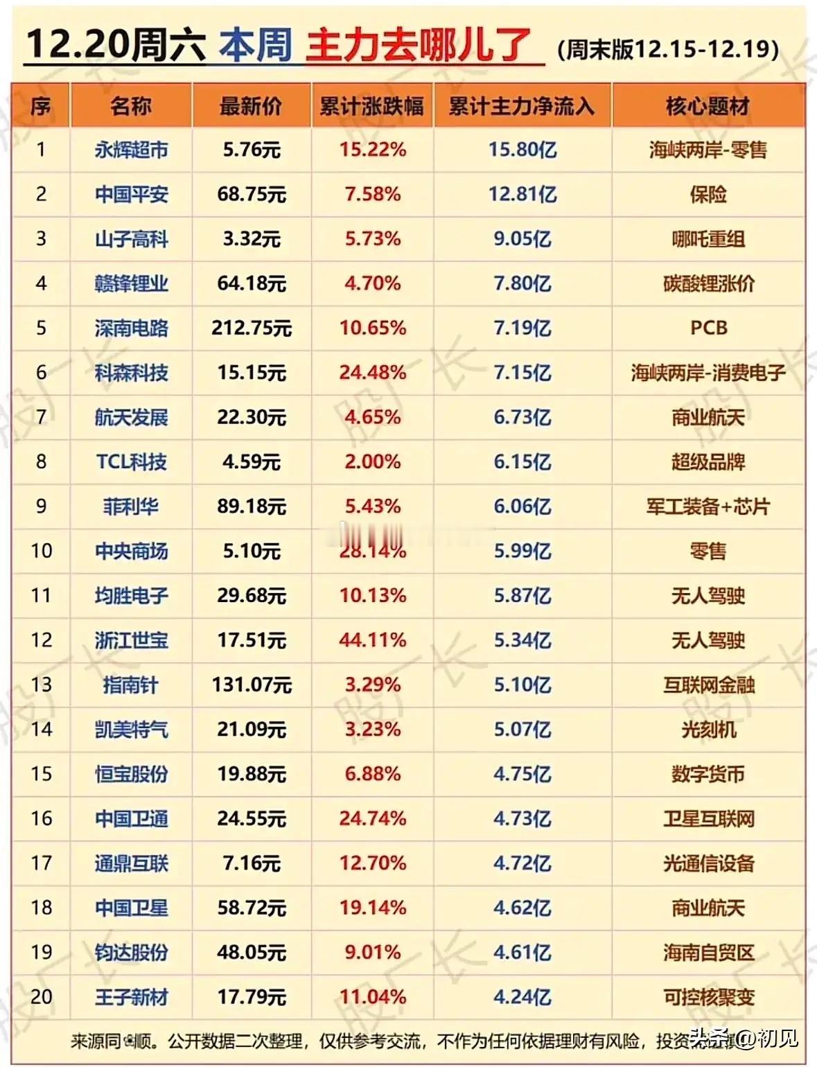 12.15-12.19本周主力资金流入个股榜单(周末版)本次梳理涵盖20只个股,标注了最新价、累计涨跌幅、主力净流入及核心题材;主力净流入规模从4.24亿至15.80亿不等,涨跌幅差异显著,浙江世宝涨幅达44.11%,题材覆盖零售、保险、军工、新能源等多领域,反映本周主力资金对消费、科技、军工等赛道的布局偏好。个股梳理1. 永辉超市:最新价5.76元,周涨15.22%,主力净流入15.80亿,题材为海峡两岸+零售。零售龙头获主力大幅流入,股价随资金上行,区域题材成短期催化。2. 中国平安:最新价68.75元,周涨7.58%,主力净流入12.81亿,题材为保险。保险龙头获大额资金流入,股价随板块回暖,业绩与行业政策为潜在支撑。3. 山子高科:最新价3.32元,周涨5.73%,主力净流入9.05亿,题材为哪吒重组。重组题材成核心看点,主力提前布局,重组进展决定后续走势。4. 赣锋锂业:最新价64.18元,周涨4.70%,主力净流入7.80亿,题材为碳酸锂涨价。锂资源龙头受涨价驱动,主力流入助推,行业供需定走势。5. 深南电路:最新价212.75元,周涨10.65%,主力净流入7.19亿,题材为PCB。PCB龙头受益电子链复苏,主力流入叠加业绩预期,股价双位数上涨。6. 科森科技:最新价15.15元,周涨24.48%,主力净流入7.15亿,题材为海峡两岸+消费电子。消费电子标的叠加区域题材,主力流入推股价大涨。7. 航天发展:最新价22.30元,周涨4.65%,主力净流入6.73亿,题材为商业航天。商业航天标的获主力布局,股价小幅上涨,行业发展进度影响后续。8. TCL科技:最新价4.59元,周涨2.00%,主力净流入6.15亿,题材为超级品牌。面板龙头获主力关注,股价微涨,面板价格周期是核心影响因素。9. 菲利华:最新价89.18元,周涨5.43%,主力净流入6.06亿,题材为军工装备+芯片。军工与芯片双题材,主力流入布局,股价温和上涨。10. 中央商场:最新价5.10元,周涨28.14%,主力净流入5.99亿,题材为零售。零售标的获主力流入,叠加板块情绪,股价大涨,消费复苏为支撑。11. 均胜电子:最新价29.68元,周涨10.13%,主力净流入5.87亿,题材为无人驾驶。无人驾驶标的获主力流入,股价上涨,技术落地与订单是看点。12. 浙江世宝:最新价17.51元,周涨44.11%,主力净流入5.34亿,题材为无人驾驶。无人驾驶领涨股,主力流入+题材热度,股价涨幅居榜单首位。13. 指南针:最新价131.07元,周涨3.29%,主力净流入5.10亿,题材为互联网金融。互金标的获主力流入但涨幅有限,行业监管影响后续走势。14. 凯美特气:最新价21.09元,周涨3.23%,主力净流入5.07亿,题材为光刻机。光刻机上游标的获主力布局,股价微涨,产业链进展为催化关键。15. 恒宝股份:最新价19.88元,周涨6.88%,主力净流入4.75亿,题材为数字货币。数字货币标的获主力流入,股价上涨,数字经济政策为驱动。16. 中国卫通:最新价24.55元,周涨24.74%,主力净流入4.73亿,题材为卫星互联网。卫星互联网龙头获主力流入,股价大涨,行业建设进度支撑后续。17. 通鼎互联:最新价7.16元,周涨12.70%,主力净流入4.72亿,题材为光通信设备。光通信标的受益产业链升级,主力流入推升股价。18. 中国卫星:最新价58.72元,周涨19.14%,主力净流入4.62亿,题材为商业航天。商业航天核心标的,主力流入+赛道热度,股价大幅上涨。19. 钧达股份:最新价48.05元,周涨9.01%,主力净流入4.61亿,题材为海南自贸区。海南自贸区标的获主力流入,股价上涨,区域政策为支撑。20. 王子新材:最新价17.79元,周涨11.04%,主力净流入4.24亿,题材为可控核聚变。可控核聚变标的获主力布局,股价双位数上涨,技术突破为催化。总结 本周主力资金主要布局消费(零售)、金融(保险、互联网金融)、科技(PCB、光通信)、军工(商业航天)、新能源(锂电、可控核聚变)等赛道,永辉超市、中国平安获资金大幅流入,浙江世宝、中国卫通等题材股涨幅居前;资金流入与股价涨幅并非完全正相关,题材热度与赛道景气度对股价的助推作用更为显著,短线需关注题材持续性与资金动向变化。本文涉及资讯、数据等内容来自网络公共信息,仅供参考,不构成投资建议!