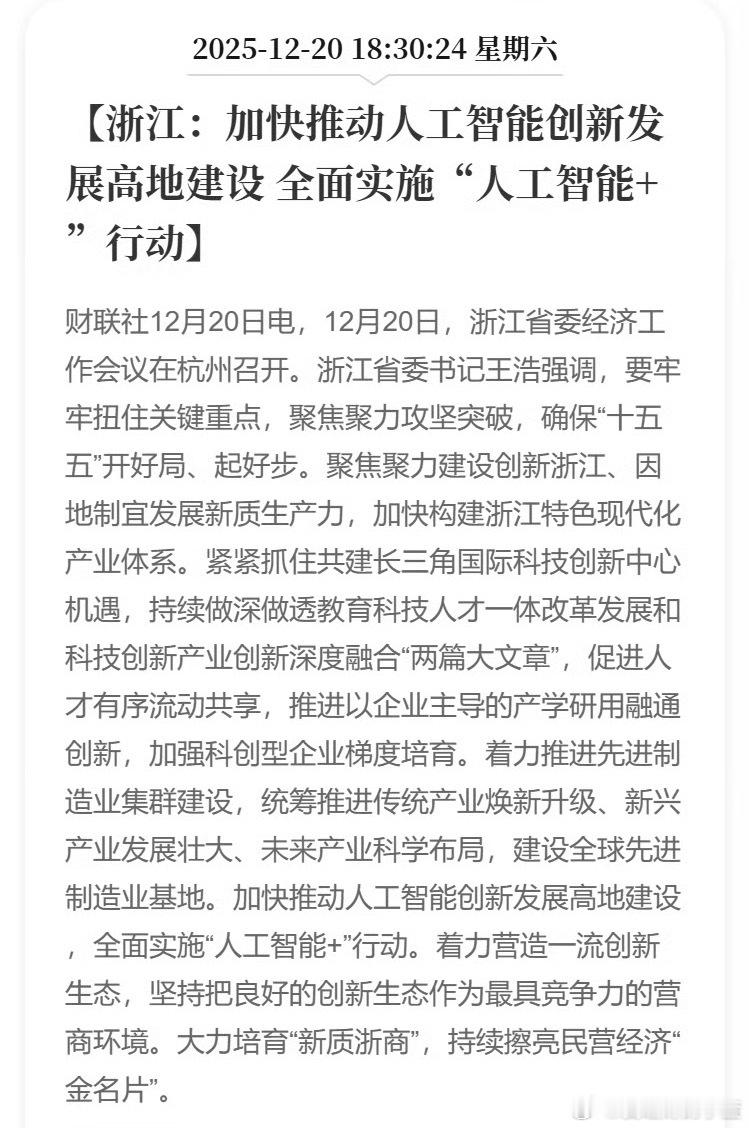 浙江:加快推动人工智能创新发展高地建设 全面实施“人工智能+”行动。
