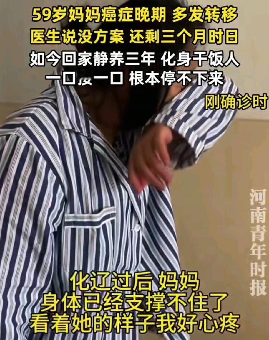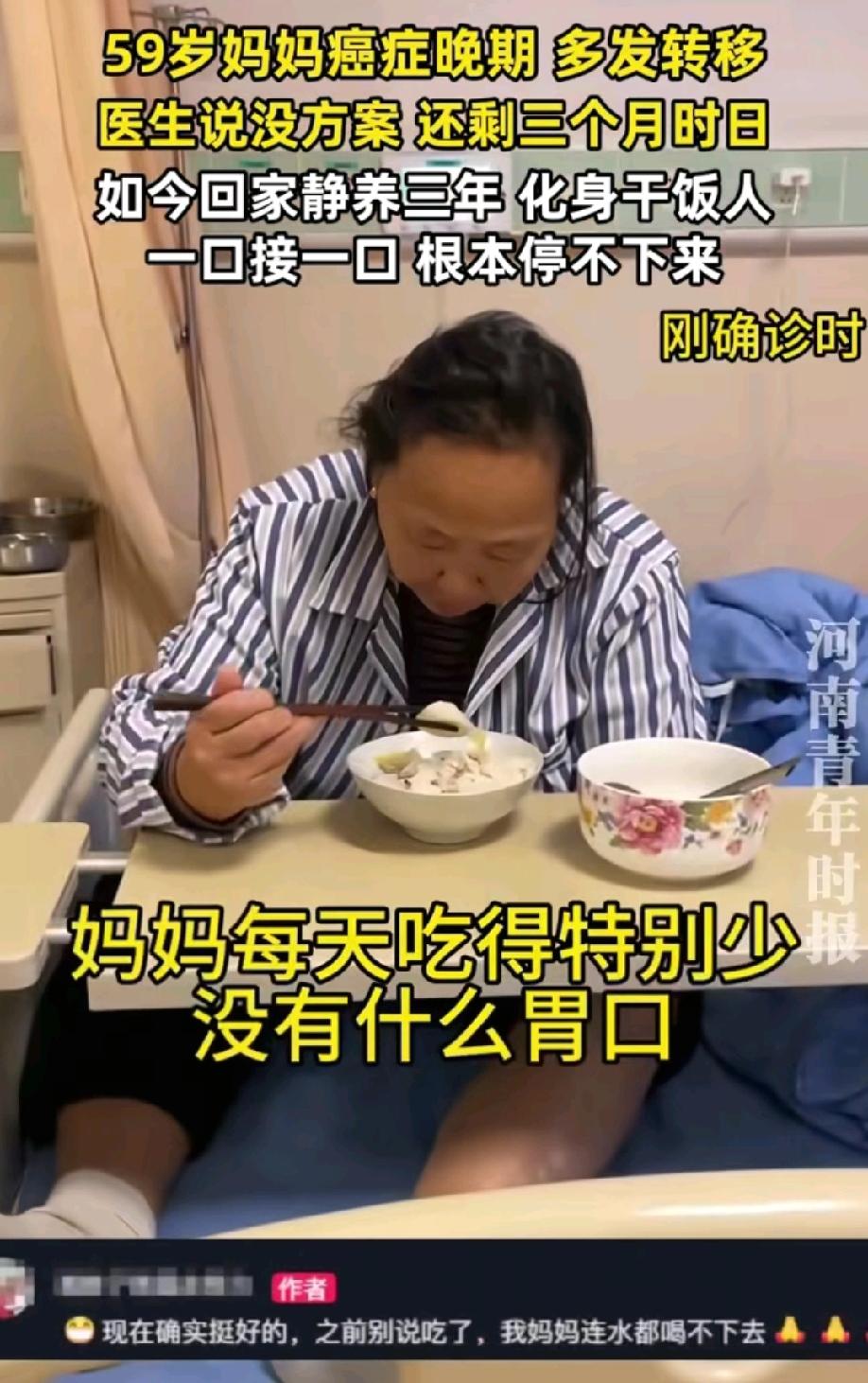 对于生病的人而言,好的心态很重要! 湖南一59岁妈妈癌症晚期,多发转移。医生说时日无多,只剩三个月了。刚确诊的时候,心态一下子崩了,吃也吃不下,精神状态很不好。化疗后,肝肾损伤严重,妈妈身体状况,让女儿心疼不已。最后放弃化疗,选择保守治疗。 没想到回家三年,女子心态转变了,乐观了,化身干饭人,一口接一口,根本停不下来。 肿瘤科主任说癌症病人80%都是吓死的。所以不管啥病,心态一定要好,能吃能喝,才有力气对抗那些癌细胞。 看女子吃玉米的架势好的很,再活十年没问题。什么都别想,心态好,一切都会好起来的!