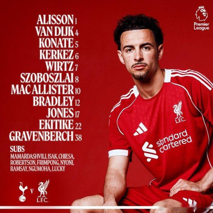 热刺vs利物浦 首发阵容⬇️ 01:30开赛!热刺首发:1-维卡里奥、17-罗梅罗、23-波罗、24-斯彭斯、37-范德芬、30-本坦库尔、14-格雷、15-贝里瓦尔、7-西蒙斯、20-库杜斯、39-穆阿尼利物浦首发:1-阿利松、4-范戴克、5-科纳特、6-凯尔凯兹、12-布拉德利、7-维尔茨、8-索博斯洛伊、10-麦卡利斯特、17-琼斯、38-赫拉芬贝赫、22-埃基蒂克英超联赛