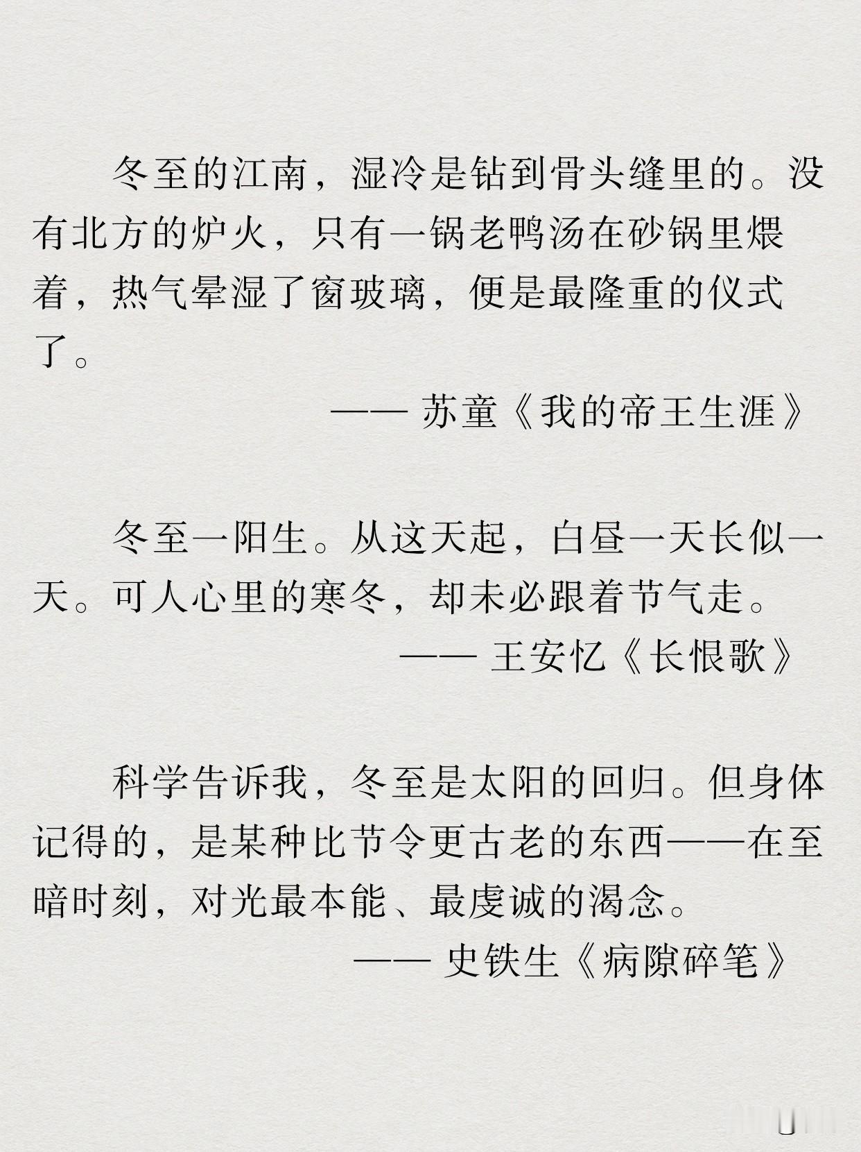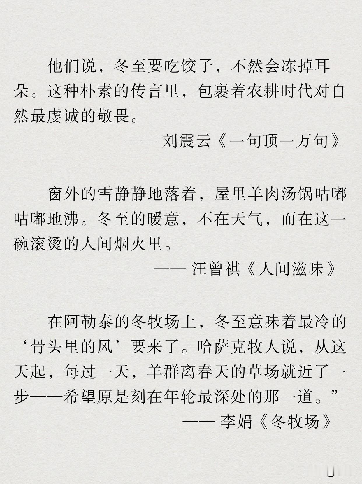 冬已至,春未远; 夜最长,光渐长。 这个冬至,无论你身在何处,愿你都有一处灯火可亲,一份温热可依。 因为,真正的暖意,从来都在这一碗滚烫的人间烟火里。 还有哪些适合在冬至读的文字呢?欢迎分享在评论区。 冬至
