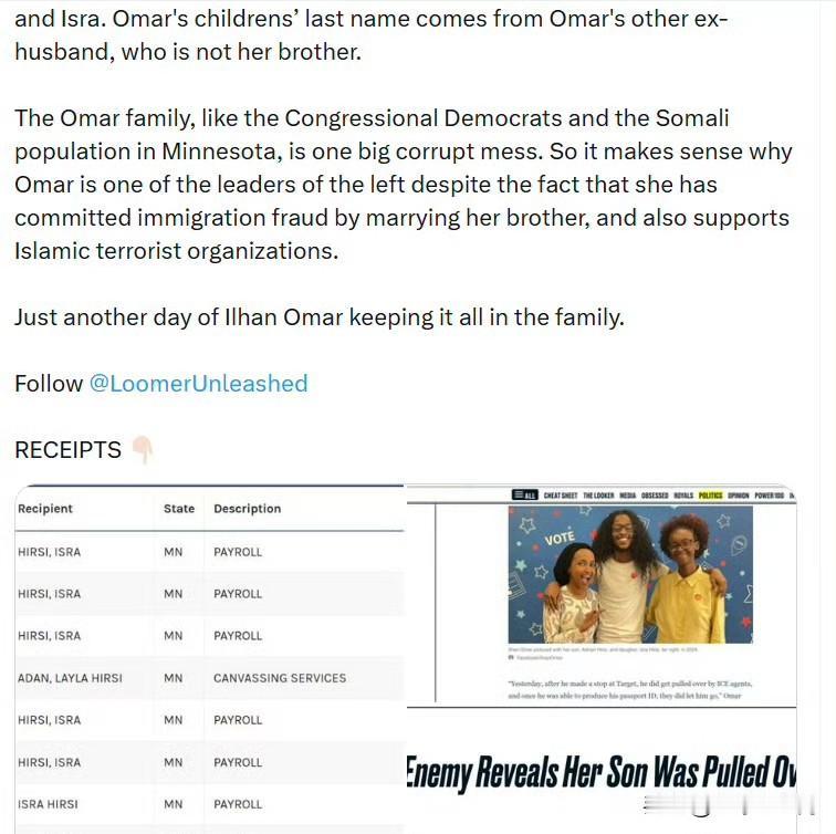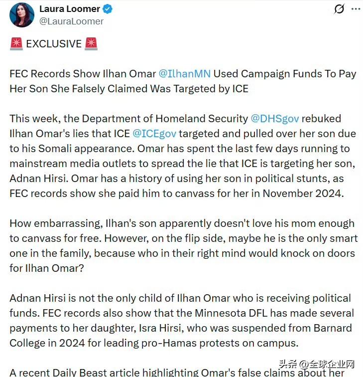 劳拉·卢默: 联邦选举委员会(FEC)记录显示,伊尔汗·奥马尔使用竞选资金支付她的儿子,而她此前虚假声称儿子遭ICE针对。 本周,国土安全部驳斥了奥马尔关于ICE因其儿子的索马里外貌而针对或拦截他虚假说法。过去几天,奥马尔一直跑到主流媒体散布谎言,说ICE在针对她的儿子阿德南·赫尔西。FEC记录显示,奥马尔有利用儿子进行政冶操作的历史,她在2024年11月曾支付儿子为她进行竞选宣传。 真是令人尴尬,奥马尔的儿子显然不够爱妈妈,不愿意免费做宣传。不过,从另一个角度看,他也许是家里唯一聪明的人——毕竟谁会心甘情愿去为伊尔汗·奥马尔挨家挨户敲门呢? 阿德南·赫尔西并不是奥马尔唯一获得政资冶金的孩子。FEC记录还显示,明尼苏达民主党联邦选区曾向她的女儿伊斯拉·赫尔西支付多次款项。伊斯拉在2024年因在校园内领导亲哈马斯抗议活动而被巴纳德学院停学。 最近《每日野兽》刊文,指出奥马尔关于儿子被ICE拘留的虚假说法,并附有奥马尔与孩子阿德南和伊斯拉的合照。奥马尔孩子的姓氏来自她的另一位前夫,并非她的兄弟。 奥马尔一家,就像国会民左党和明尼苏达的索马里族群体一样,是一个庞大的腐败混乱团体。所以可以理解,为什么奥马尔能成为左派的领袖之一,尽管她曾因与兄弟结婚而犯下移民欺诈,同时还支持伊斯兰恐布组织。