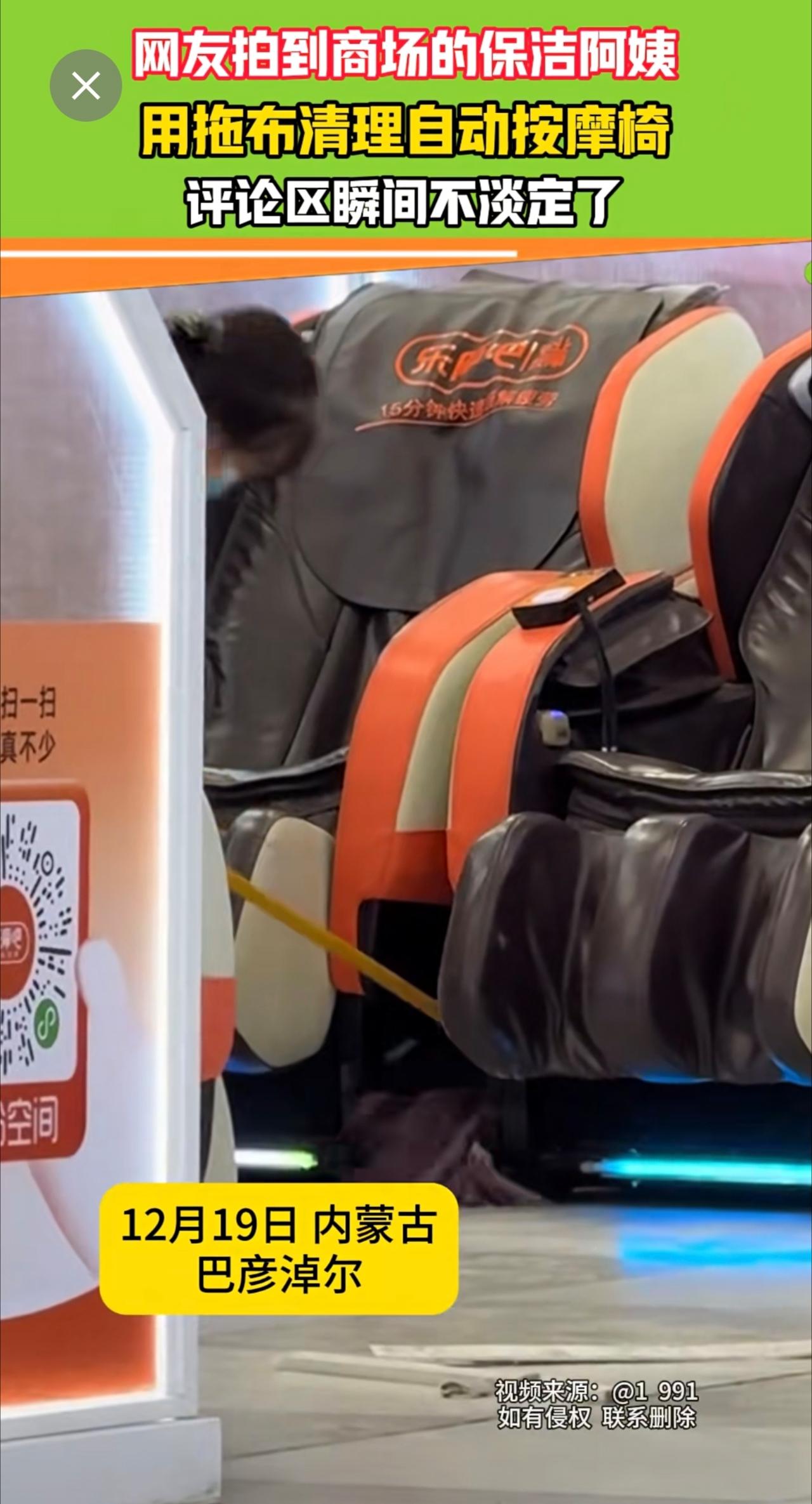 保洁阿姨用拖布清理自动按摩椅,网友不淡定了按摩椅