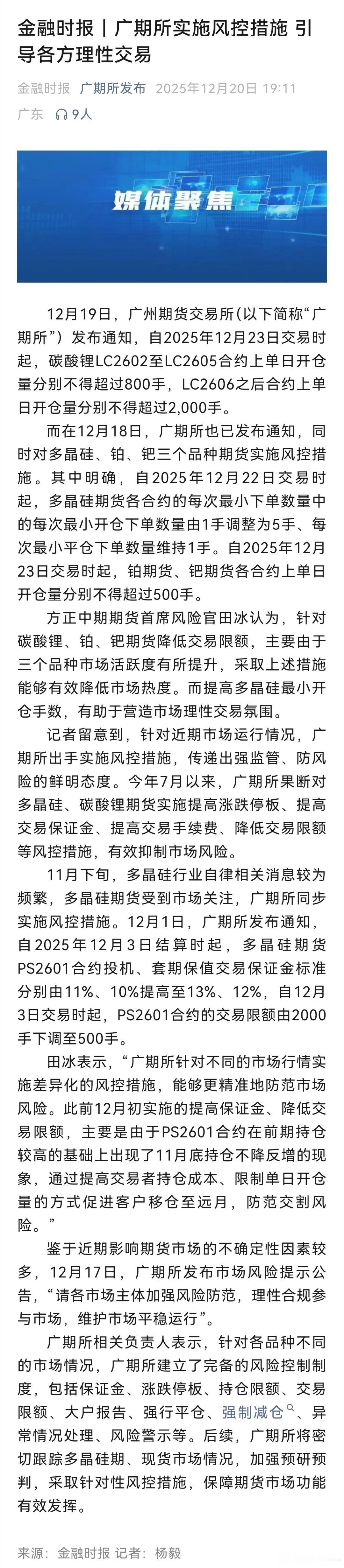 广期所的文章引用人民日报和金融时报,意思就是在告诉大家(特别是违法违规交易),现在主流官方媒体豆报道了,市场关注度很高,都悠着点…期货