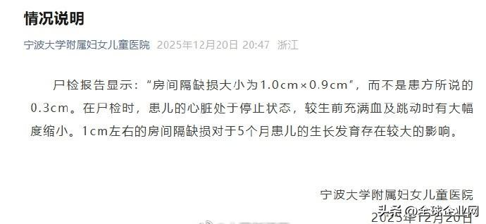 【医院发布小洛熙尸检报告情况说明】医院回应小洛熙房间隔缺损大小质疑 宁波大学附属