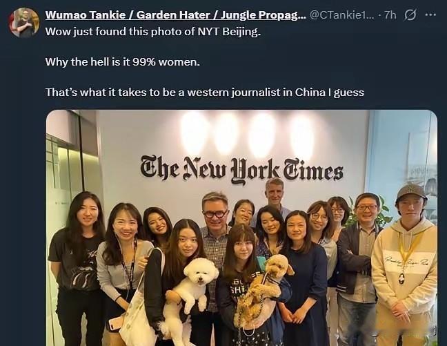 《纽约时报》驻北京工作人员合影。照片可见,绝大多数编辑工作人员都是女,有网友评论说,看那两个白人员工的表情,如同“身处后宫”,简直太到位了。