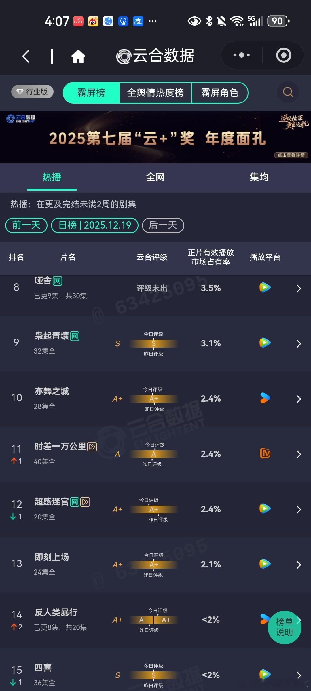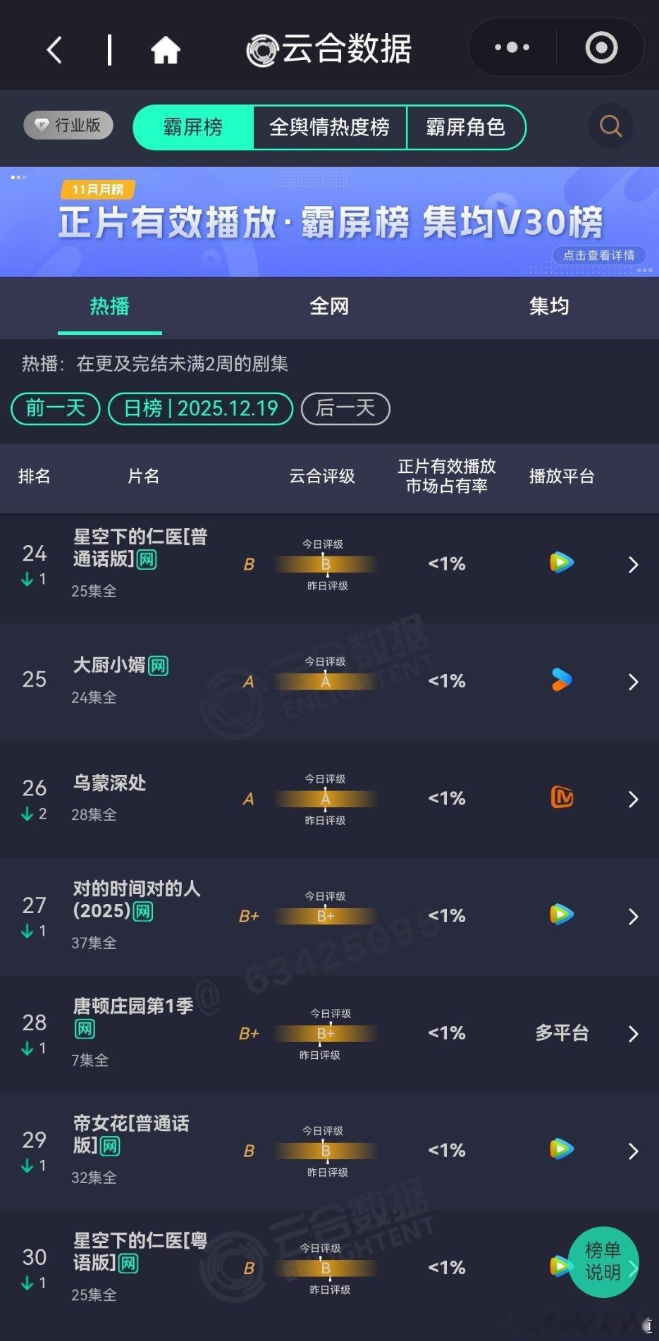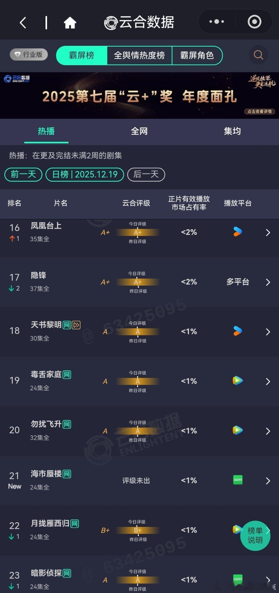 12月19日云合播放占比云合 老舅云合21%评级S+,牛啊,昨天听到一个解说把男主称作二胖,听了半天才知道说的就是老舅这部剧。长安二十四计13.3%真好,评级略有上升,七连涨了。狙击蝴蝶10.7%双轨9%起不来了。风与潮7.6%排播很坑,不过长尾可能会不错的。哑舍3.5%横盘得好快。