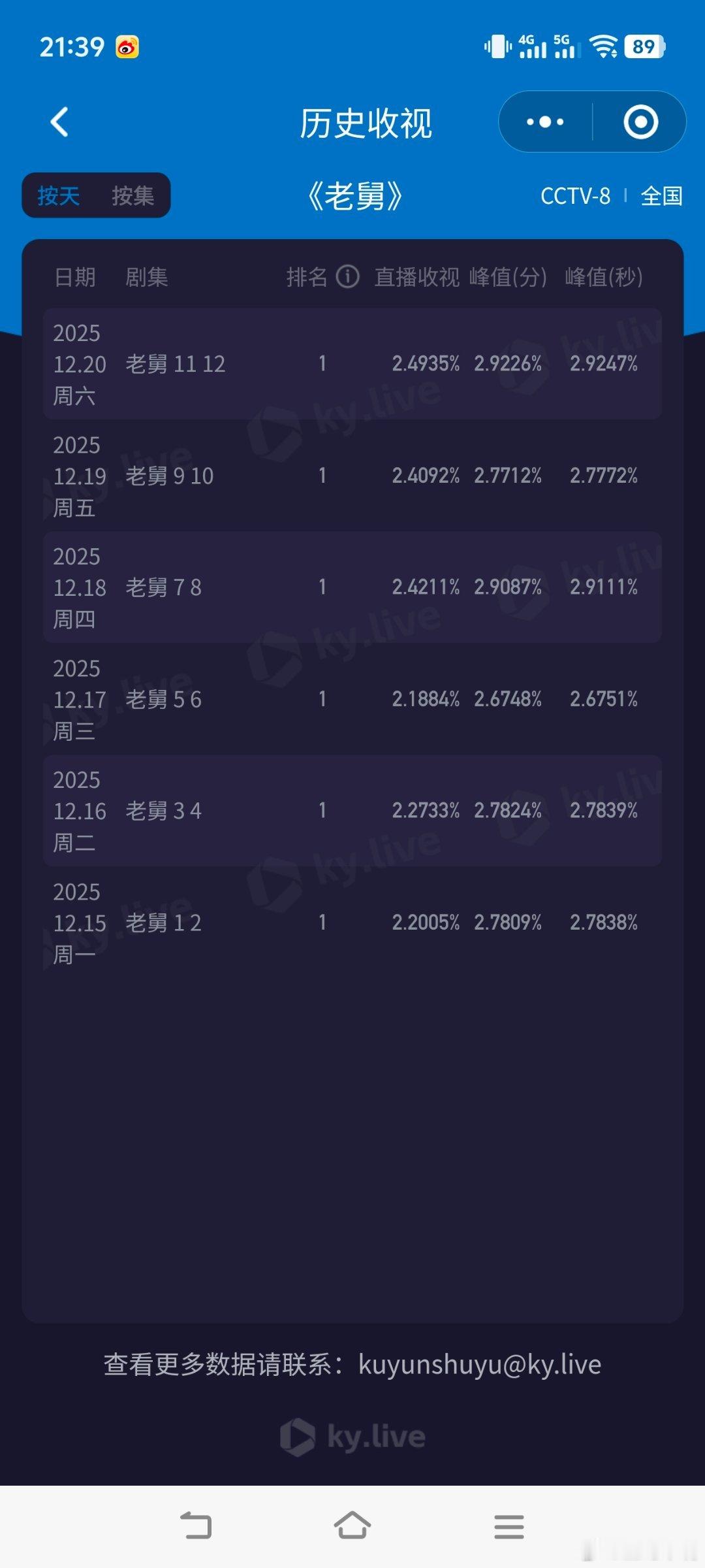 电视剧老舅周六晚《老舅》酷云收视创新高!峰值2.9247,平均2.4935,双双创新高!今晚cvb估值:2.4935×0.865=2.157按照这个走势,播完cvb预计集均在2.05-2.15之间!