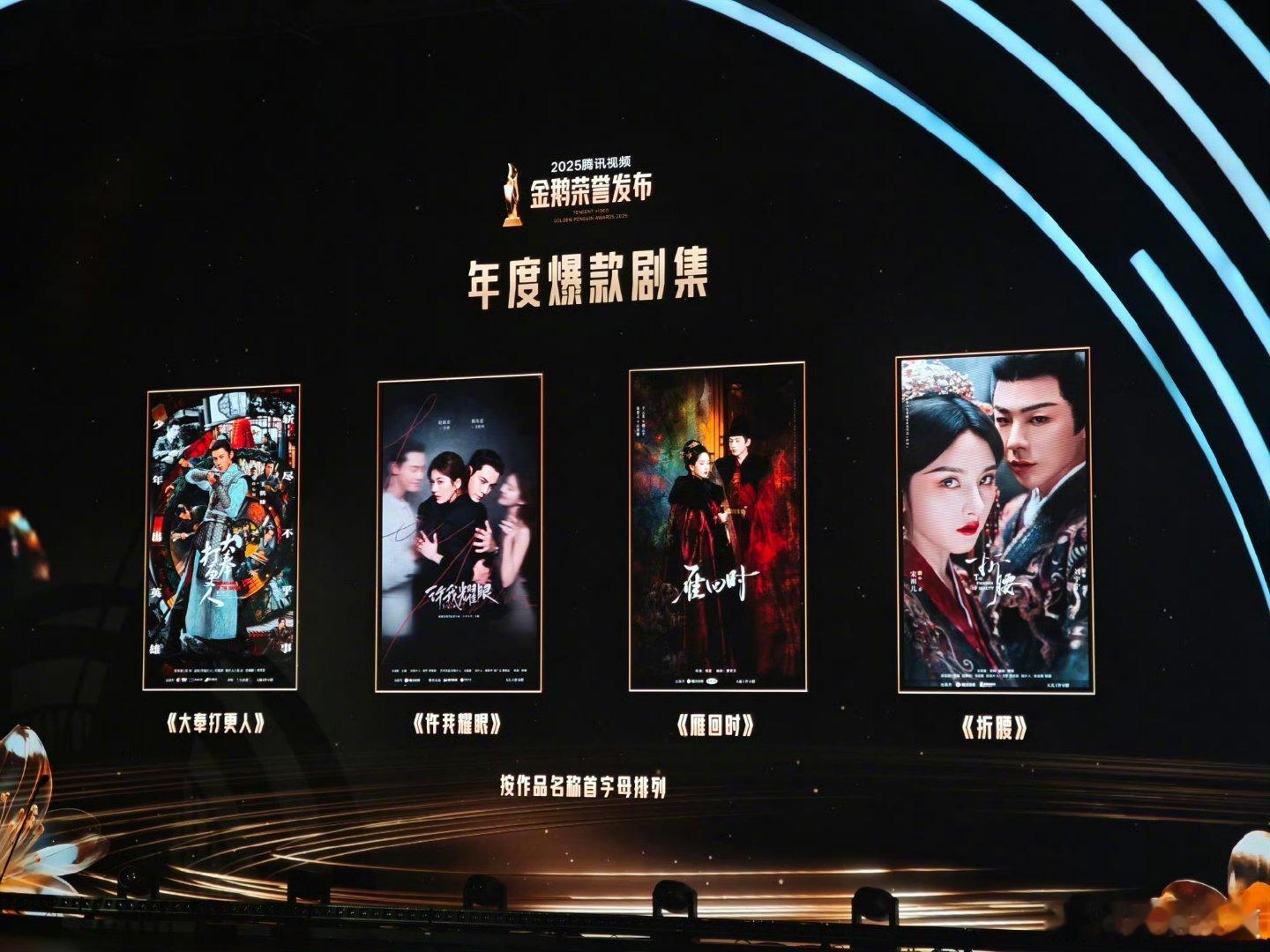 腾讯年度爆剧恭喜《大奉打更人》、《许我耀眼》、《雁回时》、《折腰》获得金鹅荣誉年度爆款剧集!