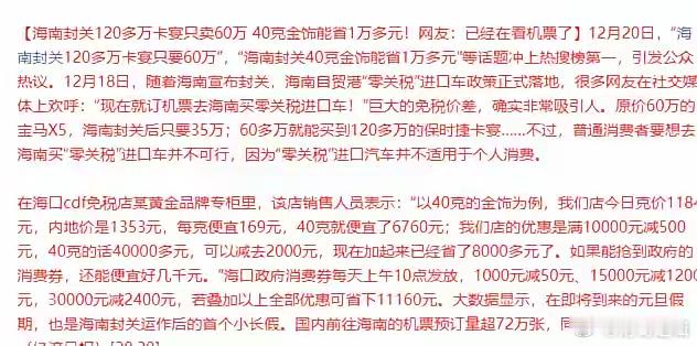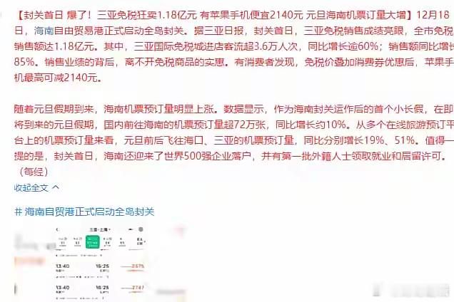 周末消息面,海南封关免税消息刷屏,周五海南板块大涨5.19%,全A地区行业板块第一,12月18日正式封关大跌,明显的弱转强。海南周五更多的是消费逻辑,免税逻辑,周末很明显,消费逻辑加强,下周市场延续预期,叠加元旦假期,旅游,消费,观察从福建板块出来的资金能否进入海南。周五尾盘,福建龙头集体直线跳水大跌,平潭发展,合富中国,东百集团,海峡创新等,炒地图的都是一类资金,之前福建,海南一直联动。下周重点观察,海南自贸板块。1.封关首日 爆了!三亚免税狂卖1.18亿元 有苹果手机便宜2140元 元旦海南机票订量大增2.海南封关120多万卡宴只卖60万 40克金饰能省1万多元!网友:已经在看机票了