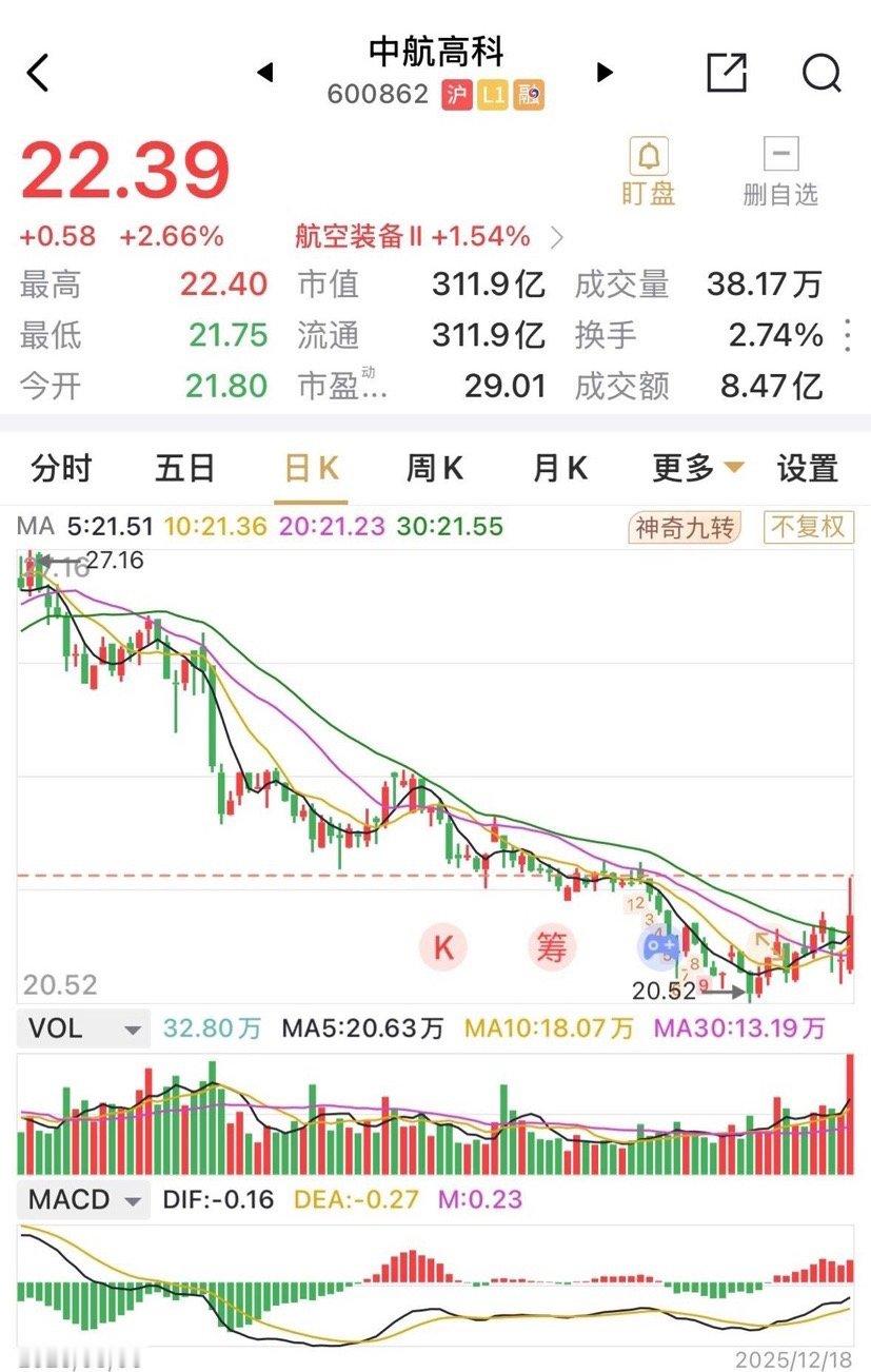 中航高科连续的两个中阳线放量上涨,触底反弹迹象明显。周四、周五的表现均比板块涨幅略强。不指望反转希望本轮反弹能够让我顺利解套成功。当时可是在26-27元高位看其像想向上突破才进入的,谁知道会向下深调呢!如今成本在24.0元之下,大概还有6个点的浮亏。连续四个月的回踩,如今月线止跌,涨约7%,估计能够先演绎成周线级别的上涨。