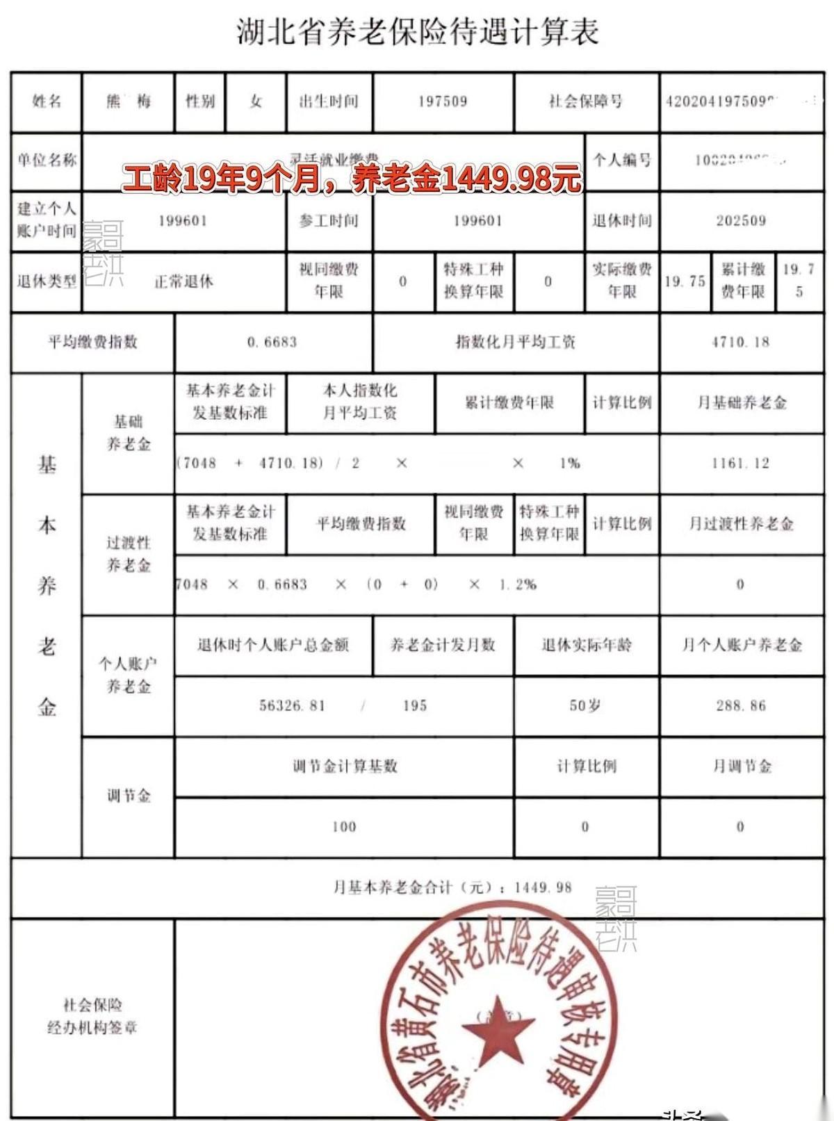 5万6的个人账户,交了快20年的社保,最后退休金一个月1450块。 这是湖北黄石一个姐姐,明年刚好50岁,马上要拿退休金了。 数字一出来,好多人肯定倒吸一口凉气:怎么才这么点? 但说句扎心的大实话,这恰恰是社保最公平、最不跟你绕弯子的地方。 它就像你年轻时的一个存钱罐。 你往里扔的是真金白银,它老了才吐得出来。你缴费的年头长、基数高,它就给你吐得多;你中间断了十年,只按最低标准交,那它也只能给你“细水长流”。 那个断缴的十年,像不像我们很多人心里“世界那么大,我想去看看”的冲动? 那个0.6的缴费系数,像不像我们每个月手头紧巴巴时,安慰自己“先交个最低档保住资格就行”的侥幸? 生活就是这么个账本,一笔一笔,算得清清楚楚。 它不会因为你过程多坎坷、多不容易,就在结果上给你放水。 看到这个1450块,我一点也不觉得是社保“坑”。 我只看到了一个活生生的提醒: 养老这件事,别总指望奇迹,多指望指望那个年轻时咬着牙、一天都不敢断供的自己吧。