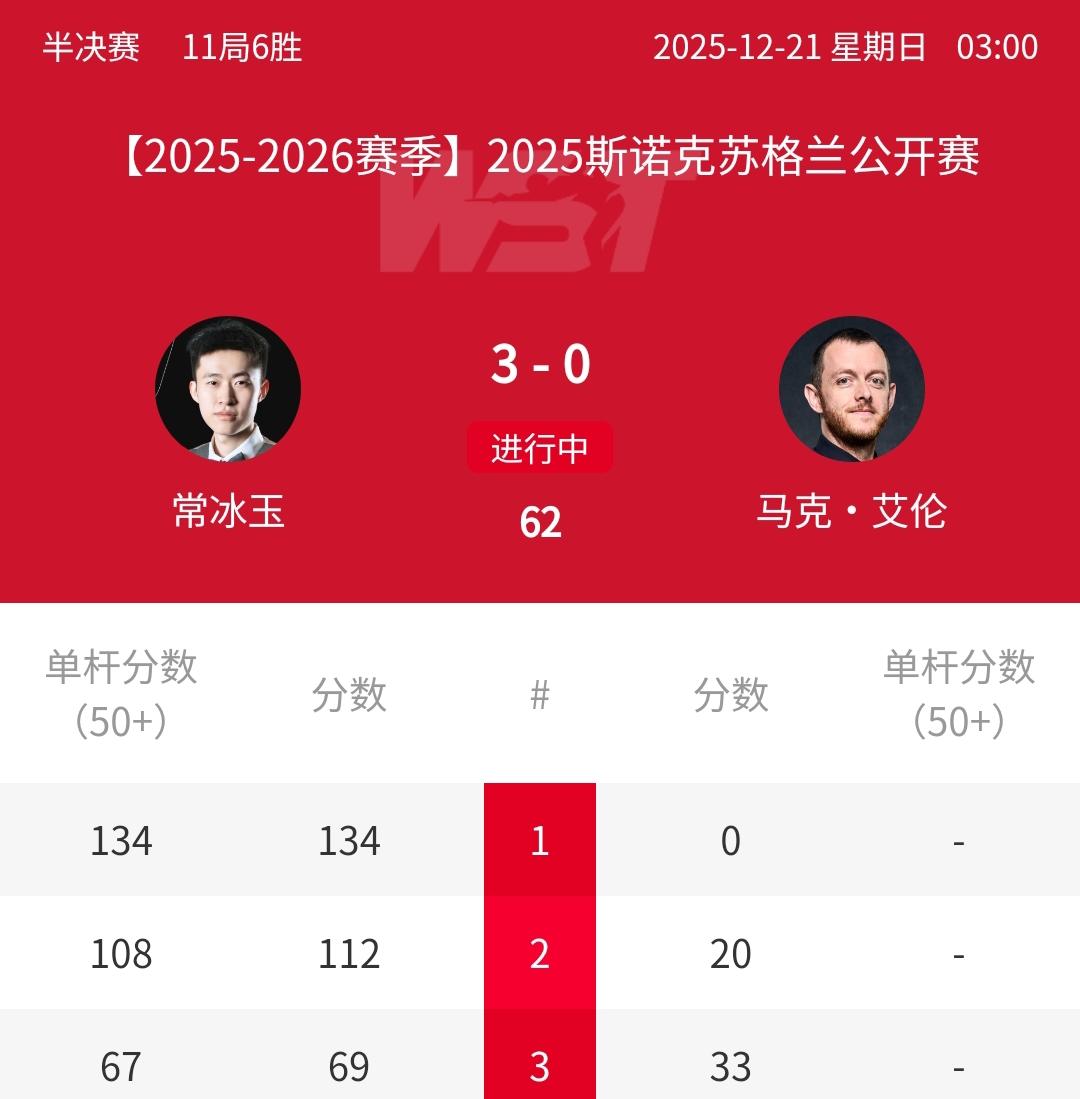 3-0,轰134+108分,中国小将常冰玉开场打爆“小钢炮”马克-艾伦!北京时间12月21日凌晨,2025年斯诺克苏格兰公开赛激战正酣。正在进行的第二场半决赛,中国小将常冰玉状态神勇,第三局结束后,他以3-0的比分打爆“小钢炮””马克-艾伦。比赛第一局,常冰玉没有任何预热就快速进入状态,他轰出单杆134分,1-0强势开局。第二局,常冰玉又轰出单杆108分,2-0领先。第三局,常冰玉送出单杆50+,比分优势扩大到3-0。赵心童 丁俊晖