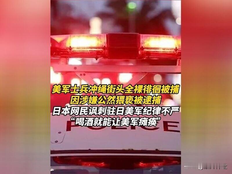 一美军士兵在冲绳县街头“全裸”徘徊,被逮捕 据《冲绳时报》报道,当地时间12月19日凌晨,在冲绳县北谷町有居民发现一名美国海军士兵全身裸体在街上徘徊,警方以男子涉嫌公然猥亵将其逮捕。 据报道,涉事男子22岁,为美国海军“的黎波里”号两栖攻击舰的海兵。据称警方逮捕该男子时,他浑身散发着酒气。 这则消息引发部分日本网民的愤怒。有日本网民斥责驻日美军士兵“胡作非为”,被曝出的犯罪行为接连不断。还有日本网民讽刺驻日美军纪律不严,“只要给美军士兵喝酒就能让他们瘫痪”。