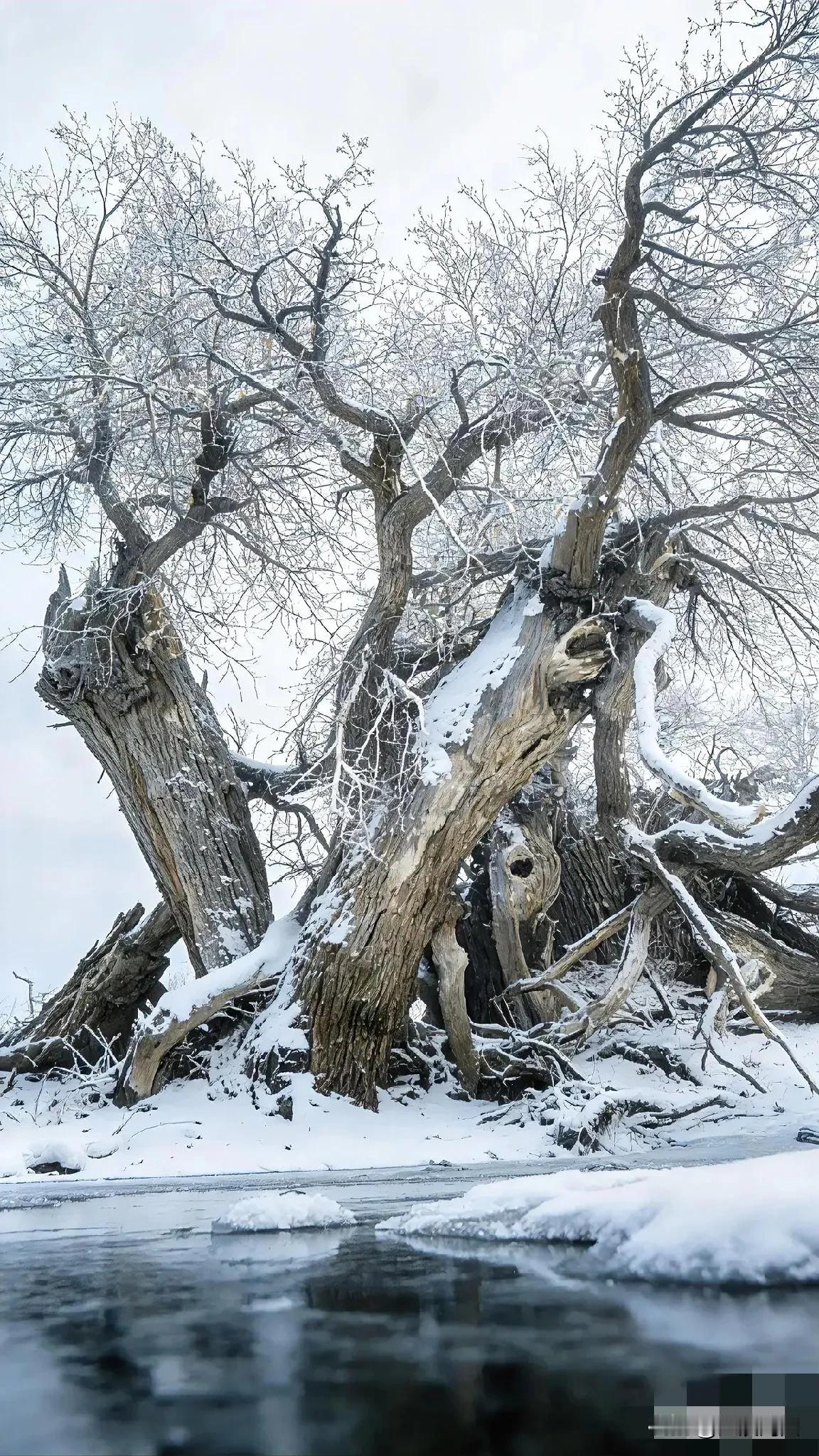冬日仙境,冰面漫步,树影婆娑,静谧如画。