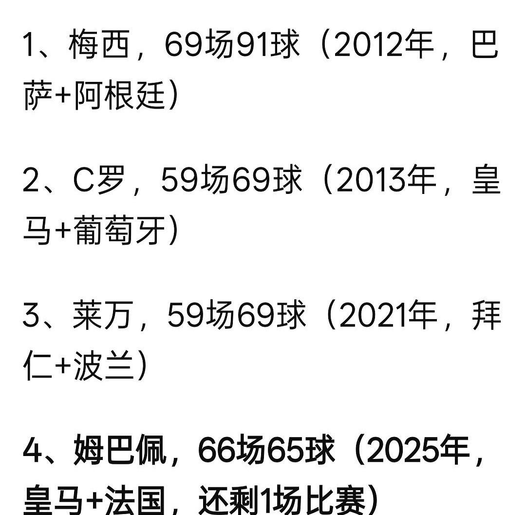 姆巴佩今年踢了66场,进了65个球。 牛逼不?当然牛逼。放眼整个足坛,都是炸裂的存在。 他自己估计也这么觉得,觉得自己马上就要摸到莱万和C罗的衣角了,马上就要站在世界之巅了。 结果一抬头,发现山顶上还坐着个人。 那个人,叫梅西。 2012年,他69场比赛,进了91个球。 姆巴佩离这个记录,还差26个球。 26个球,啥概念啊? 去年意甲金靴,一年进了25个球。 虾仁猪心。 真的,太虾仁猪心了。 你辛辛苦苦干了一整年,拼出来的业绩,只是人家当年追赶路上的一个“零头”。 你拿命换来的“最佳射手”,只是人家封神路上需要补齐的“差额”。 就问你绝望不绝望? 有时候你会觉得,人和人之间的差距,不是努力就能弥补的。 你以为你很强,在第一层沾沾自喜。 其实人家根本不在这个楼里。 人家,就是那栋楼。