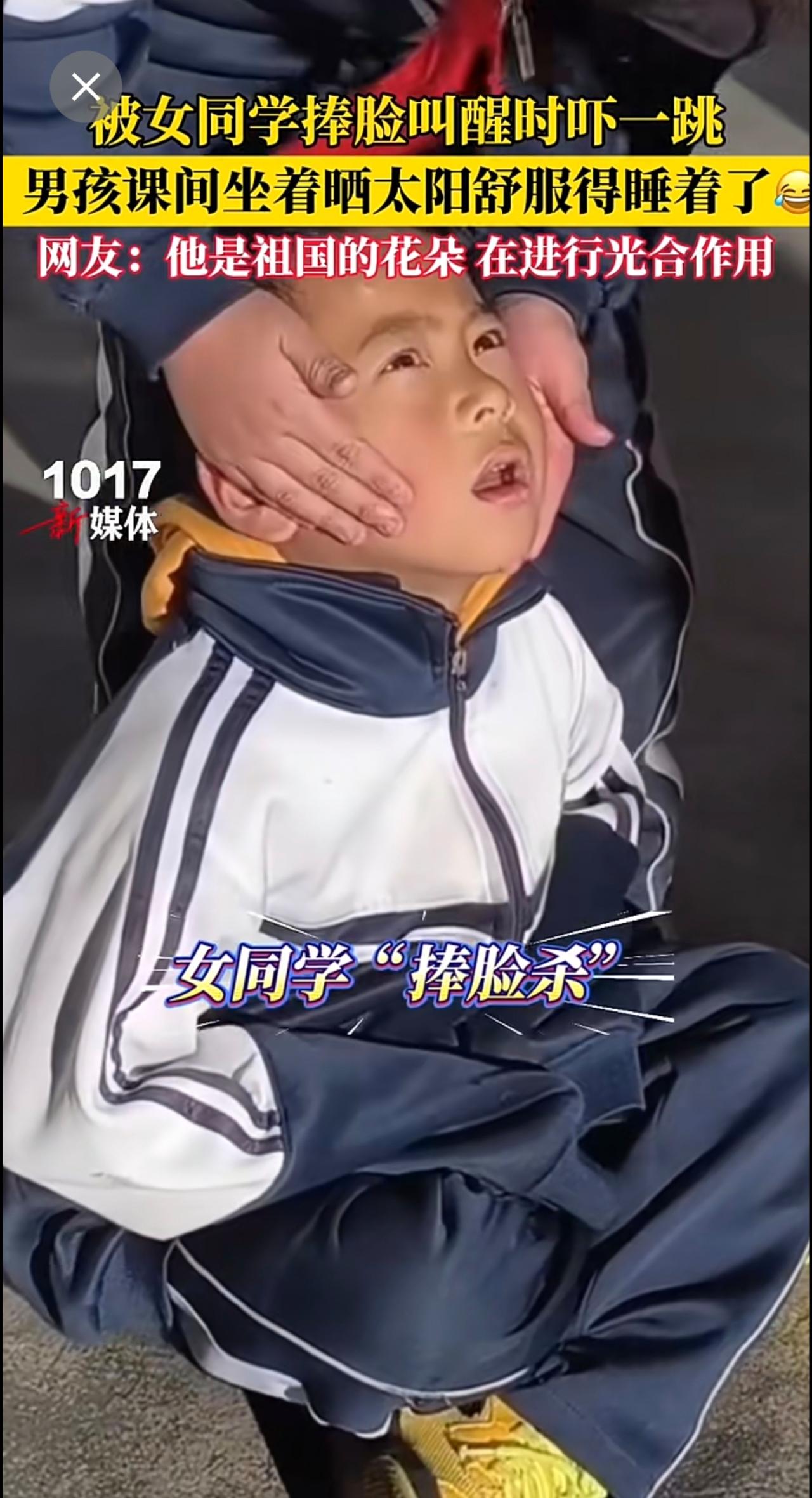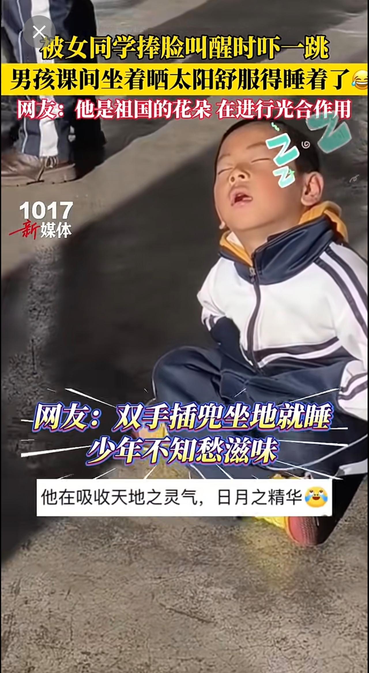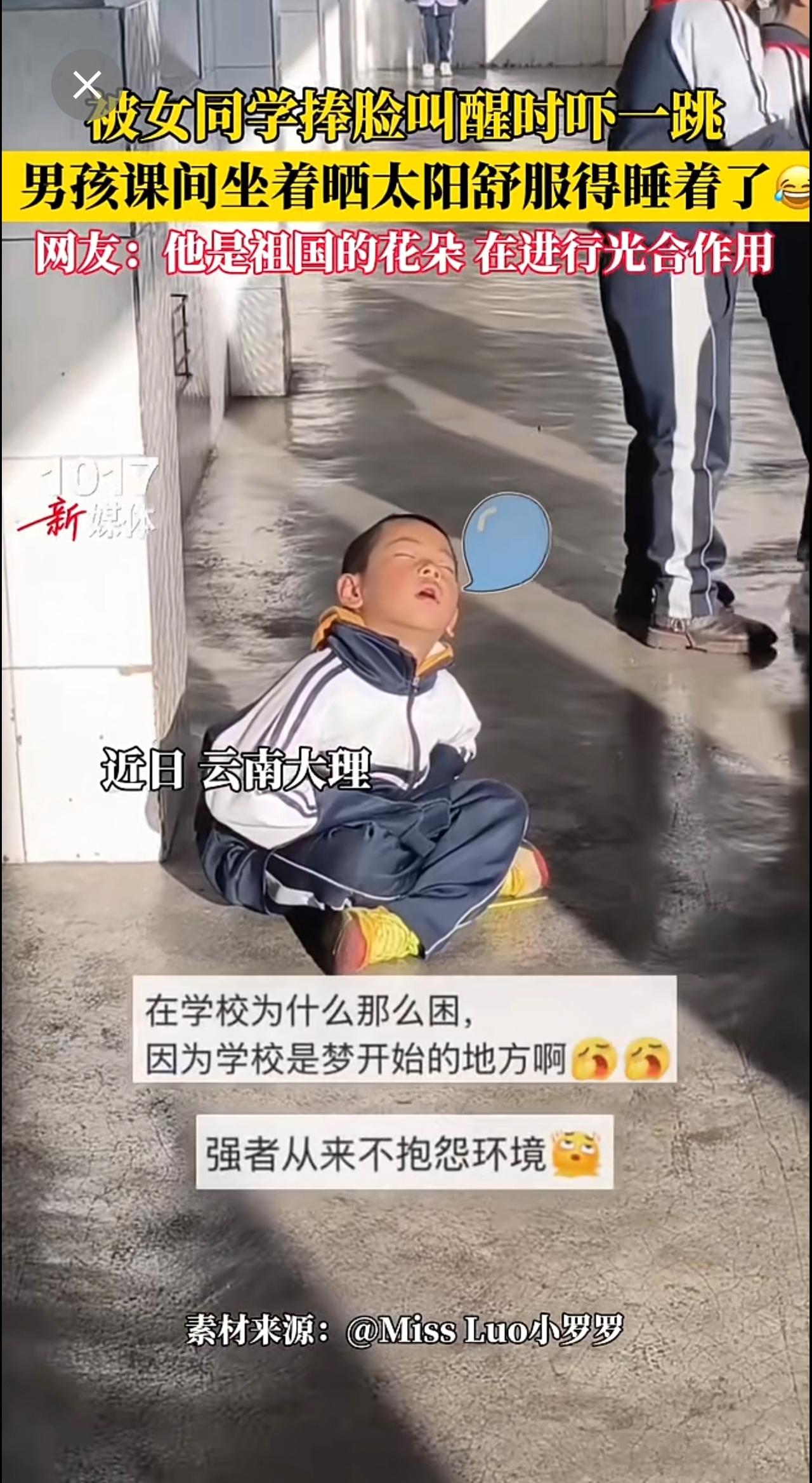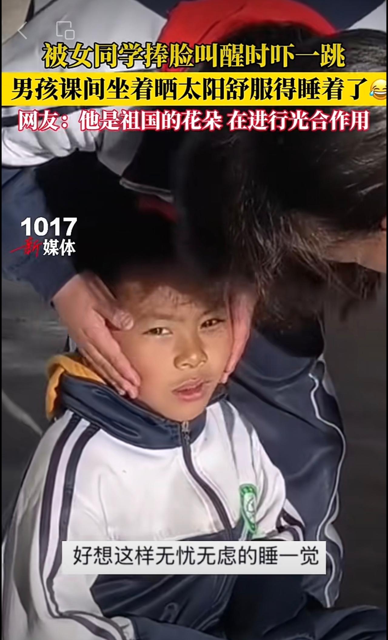 男孩课间坐着晒太阳舒服得睡着了😂,网友:他是祖国的花朵,在进行光合作用!