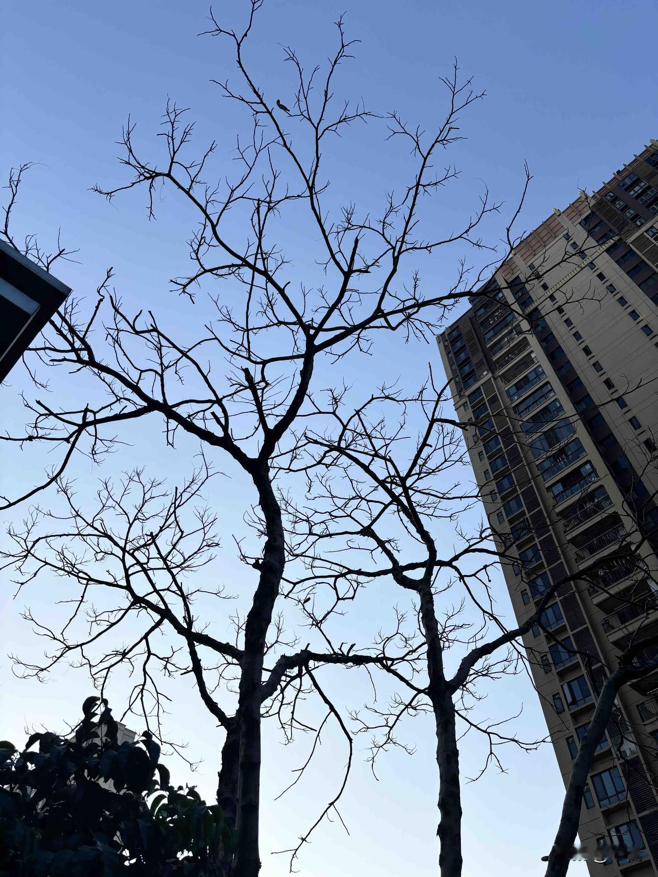 晨起,19度。 出来跑个步,抬头看到小区的一棵树,光秃秃的,在周边一片翠绿的树木中,孤独而默默的撑起一片秋冬的天空。 在广州,众树皆春夏,难得见一树度秋冬!