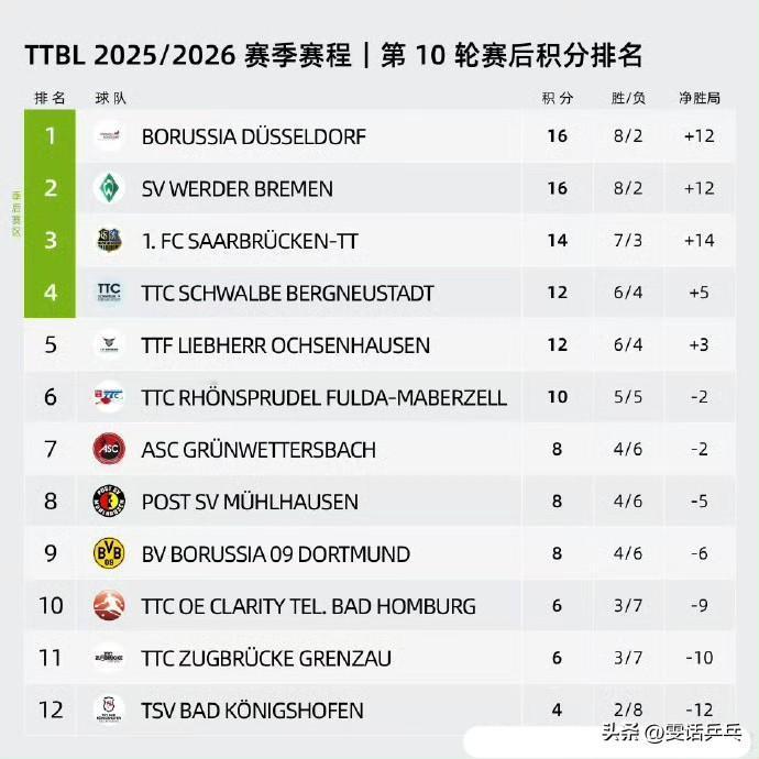 官微,@樊振东 所在的@萨尔布吕肯乒乓球甲级俱乐部第10轮赛后积分排名第三 2025.12.21