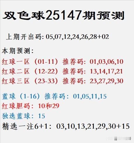 双色球25147期预测:幸运数字,等你来揭晓 上期开奖号码:05、07、12、24、26、28 + 02 本期红球预测: 一区(01-11):01、03、06、10 二区(12-22):13、14、17、21 三区(23-33):23、27、29、30 蓝球推荐(1-16):01、05、11、15 红球胆码:10、29 独选蓝球:15 精选一注6+1:03、10、13、21、29、30 + 15 奖池还有27亿,足够开出500注一等奖,个人观点,仅供参考,祝大家好运!