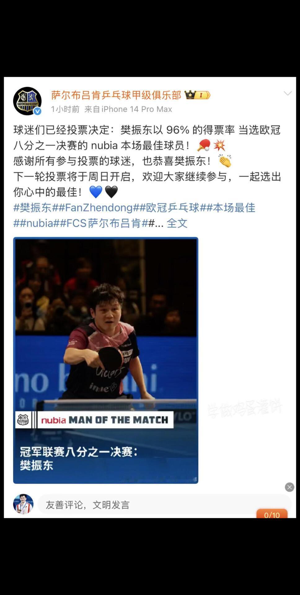 萨尔布俱乐部真的是超级肯定樊振东,眼光一致,认可说了百遍! 欧冠首秀,八分之一比赛中,绝对压倒性:最佳球员! 优秀的人在哪里都闪光,樊振东在哪里都会成功,一点没错他的事业还在后面,巅峰远不止巴黎,还有洛杉矶…