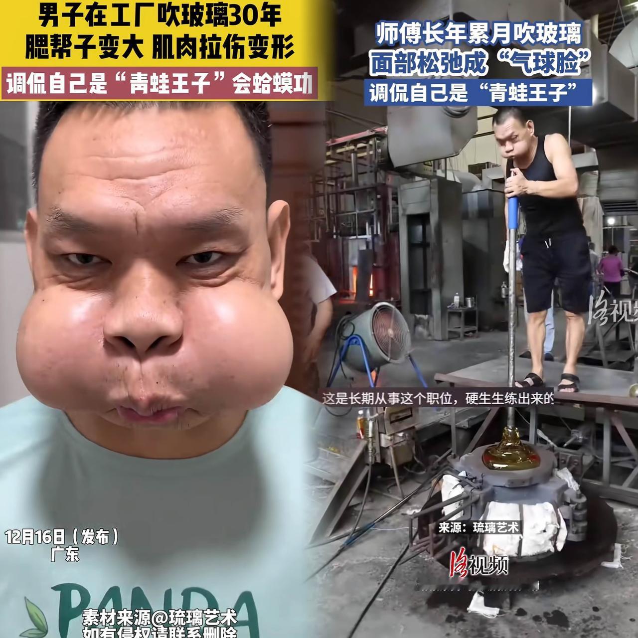 “悲剧还是发生了!” 广东张先生在玻璃厂吹了30年玻璃,一天最多吹300多个,结果 腮帮子鼓得像青蛙,面部肌肉严重拉伤,还自嘲练成了“蛤蟆功”。 网友们看着想笑,可笑着笑着就哭了——这哪是笑话,分明是血泪史! 医生说这是典型的职业病,天天吹气,面部肌肉反复拉扯,不变形才怪。 可厂里呢?明明有机器能代替,却为了省成本,硬让工人用嘴吹。 劳动保护成了空话,工人的健康就这么被牺牲了。 张先生的坚守让人佩服,但这种牺牲本不该发生。 咱们得想想,传统工艺要不要守?当然要!但守的是手艺,不是工人的健康。 别让“工匠精神”成了伤害工人的借口。你觉得呢?快来评论区聊聊你的看法!