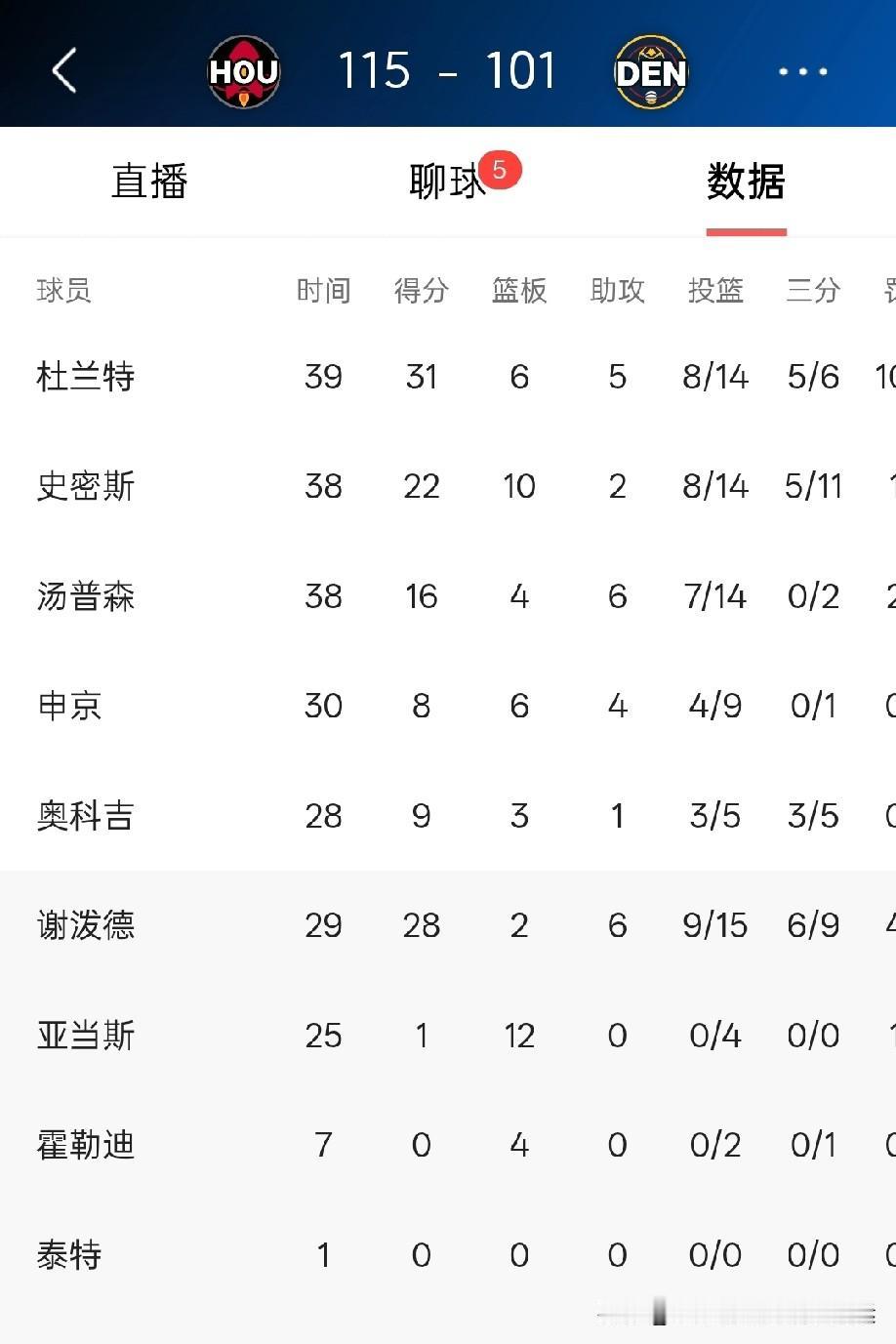 火箭客场115-101复仇掘金,本场比赛火箭三分命中率不错,奇兵谢波德在29分钟的上场时间里得到28分2篮板6助攻,可以说本场比赛谢波德发挥起到了至关重要的作用。恭喜火箭拿下一场胜利止住颓势。