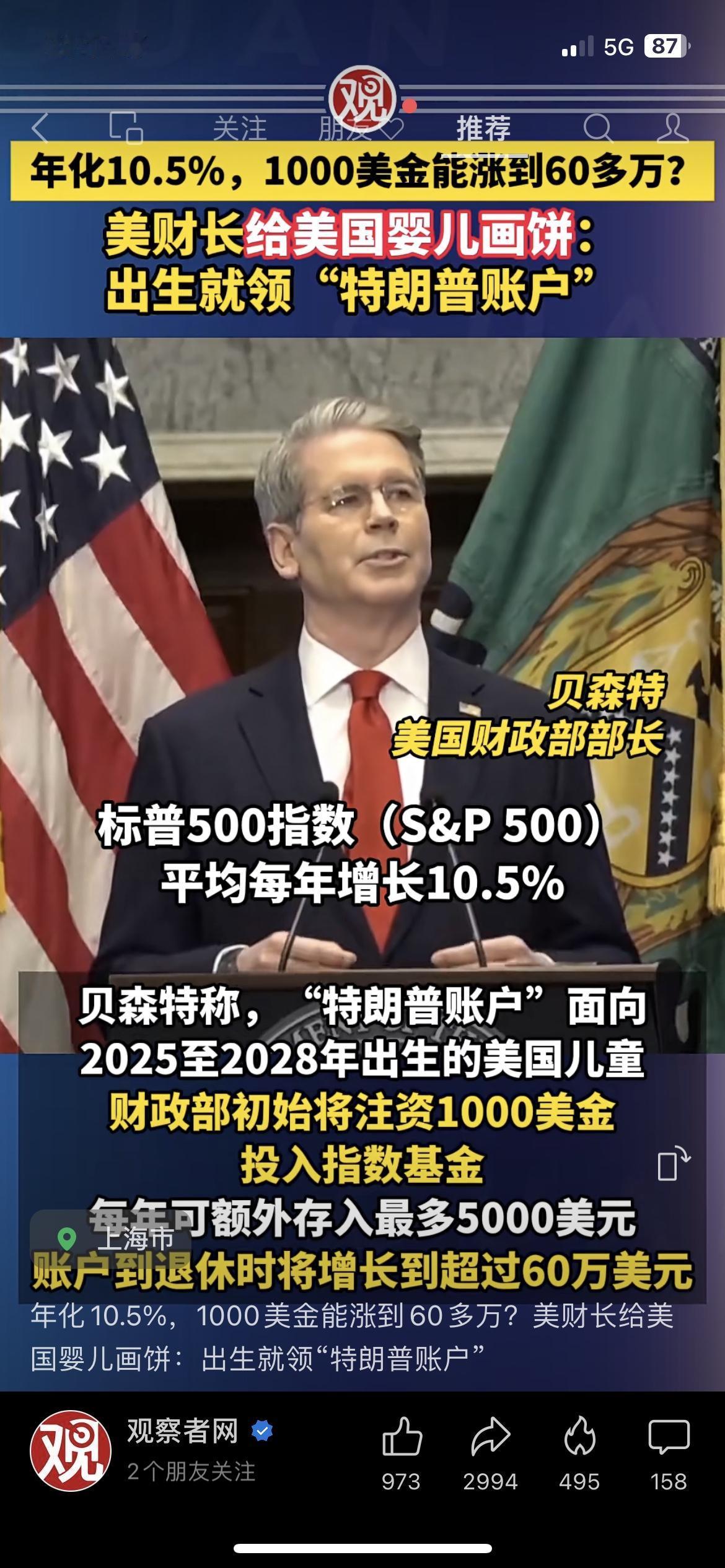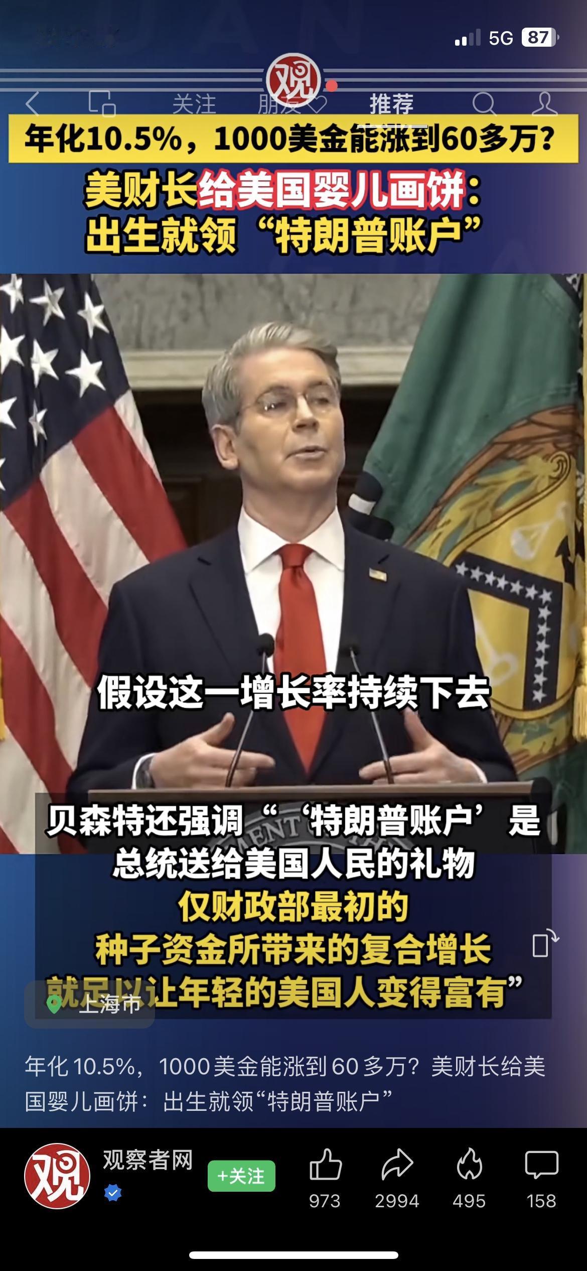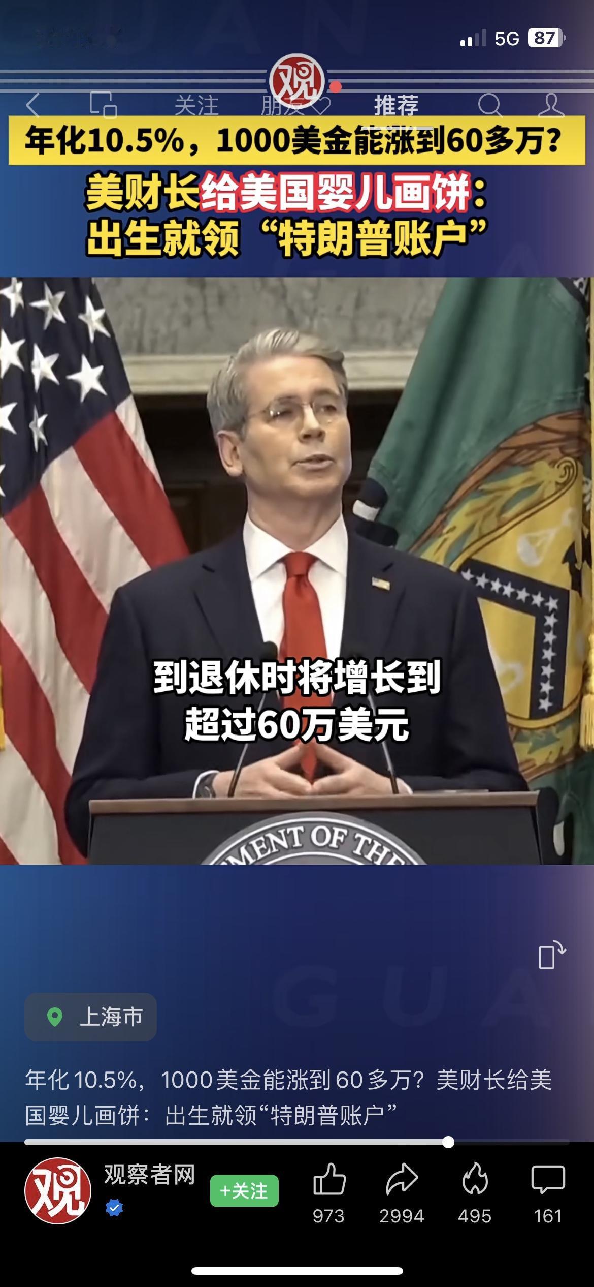 年化10.5% 1000美金能涨到60多万? 美财长给美国婴儿画饼 出生就领“特朗普账户” 宣称退休时账户金额能超60万美元 但网友一算就发现不对劲 按年化10.5%复利 要涨600倍得花近50年 而且高收益背后藏着高风险 根本不现实 你觉得这个“特朗普账户”是福利还是噱头? 特朗普资产 美国特朗普账户新政