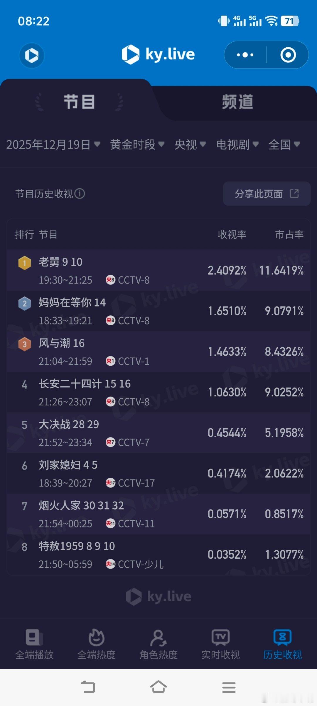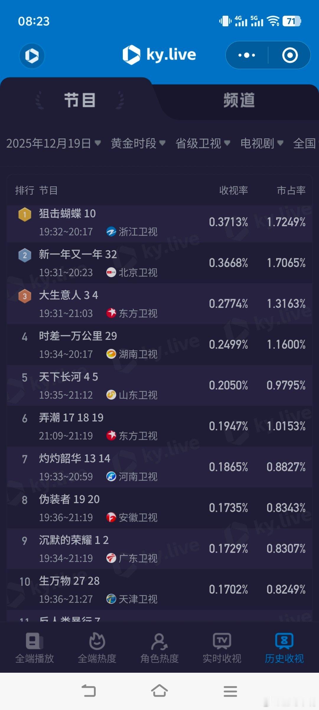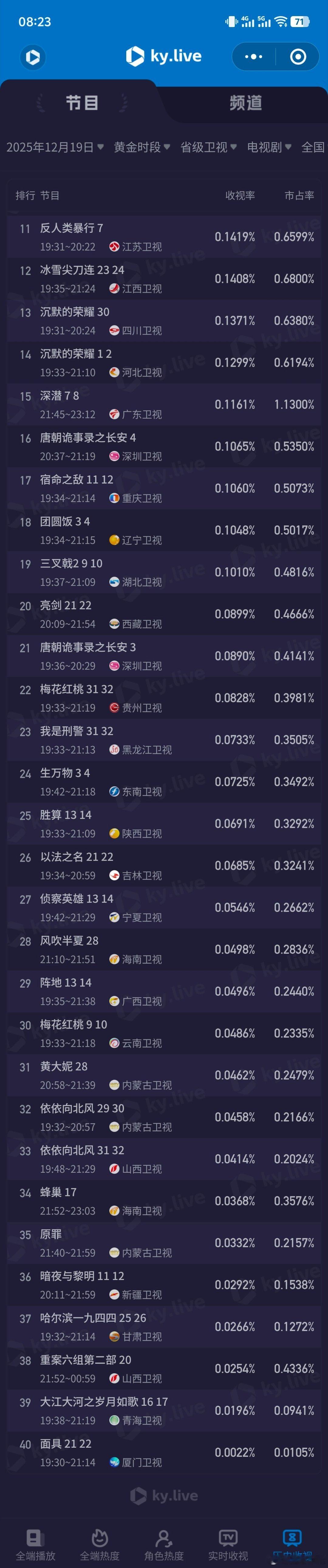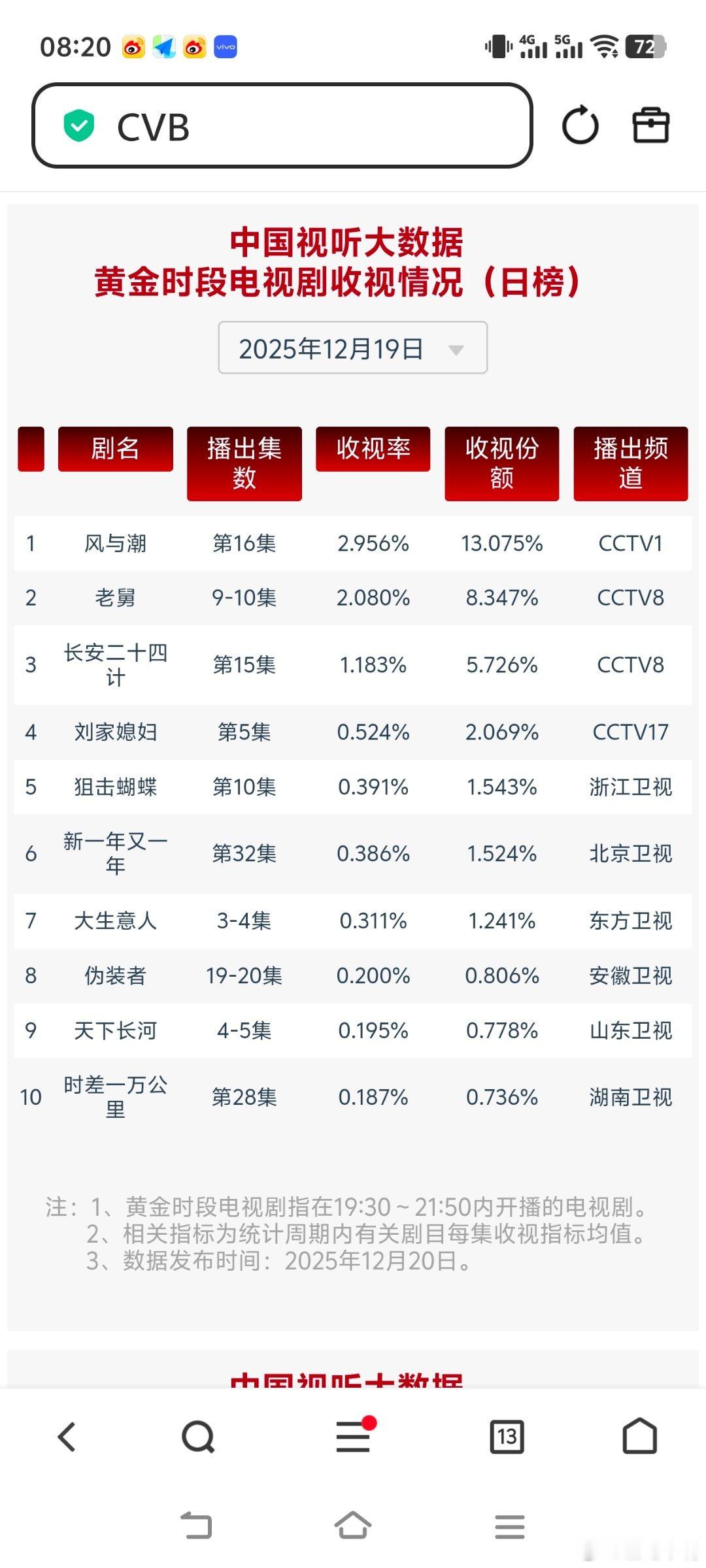 12月19日cvb收视日报风与潮 2.956,酷云1.4633,系数2.020老舅 2.080,酷云2.4092,系数0.863狙击蝴蝶0.391,酷云0.3713,系数1.053新一年又一年0.386,酷云0.3668,系数1.052大生意人0.311,酷云0.2774,系数1.121时差一万公里0.187,酷云0.2499,系数0.748狙击蝴蝶
