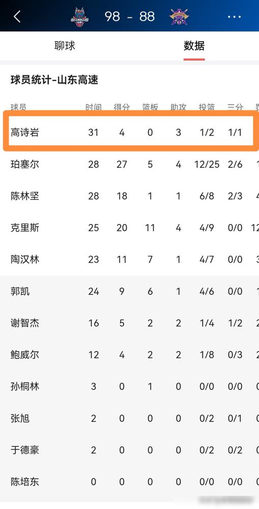 山东高速后卫高诗岩真是太不喜欢得分了!在今天山东高速主场以98:88击败北京控股的比赛中,高诗岩首发出战31分钟,投篮2中1,仅仅得到4分。 光看数据,确实会觉得他进攻欲望不强。 但篮球比赛,不是只有得分这一件事。 看看他其他的贡献:3助攻4抢断,正负值+13全队前列。 这能叫“不喜欢得分”吗?这分明是另一种赢球方式。 高诗岩在CBA一直以防守凶悍著称。 他的撕咬式防守,是很多后卫的噩梦。 这场4个抢断,就是最好证明。 他经常被安排去盯防对方的外线箭头。 消耗对手核心,为球队整体防守奠定基础。 这种脏活累活,数据很难完全体现,但教练和队友都懂。 再说出手少的问题。 山东队这场球,内线优势明显。 吉伦沃特和陶汉林在篮下翻江倒海。 球权自然更多地向内线倾斜。 高诗岩作为控卫,首要任务是梳理进攻,把球给到位置更好的队友。 2次出手,恰恰说明他阅读比赛,做出了合理选择。 一个球员的价值,不能只看出手次数。 要看他的选择是否帮助球队赢球。 这场赢了,他的选择就是对的。 现代篮球对后卫的要求越来越全面。 尤其是国内后卫,不能只当得分手。 组织、防守、带动队友,一样都不能少。 赵继伟在辽宁也经常得分不高,但没人质疑他的作用。 高诗岩走的也是这个路子。 用防守和组织来影响比赛。 这种球员,是争冠球队必不可少的拼图。 总用得分来评价一个球员,太片面了。 篮球是团队运动,分工不同。 有人负责攻城拔寨,就得有人负责干苦工、穿针引线。 高诗岩清楚自己在球队的角色定位。 并且执行得非常出色。 这种牺牲和奉献精神,其实更可贵。 球队需要他得分时,他也有过单场高分表现。 但为了赢球,他可以做任何事。 这才是职业球员的态度。 赢球是唯一的标准。 山东队这场拿下关键胜利,高诗岩功不可没。 +13的正负值不会说谎。 他在场时,球队净胜13分。 这就是他对比赛的真实影响力。 比那些华丽得分数据更有说服力。 球迷看球,真不能光盯着得分榜。 有些价值,藏在每一次成功的防守和每一次及时的传球里。 所以,别再说高诗岩“不喜欢得分”了。 他不是不喜欢,是把球队胜利放在了个人数据之前。 这种球员,应该被尊重和理解。 CBA需要更多这样全能、无私的后卫。 中国篮球也需要这种团队至上的精神。 赢球,才是硬道理。 MCN双量进阶计划