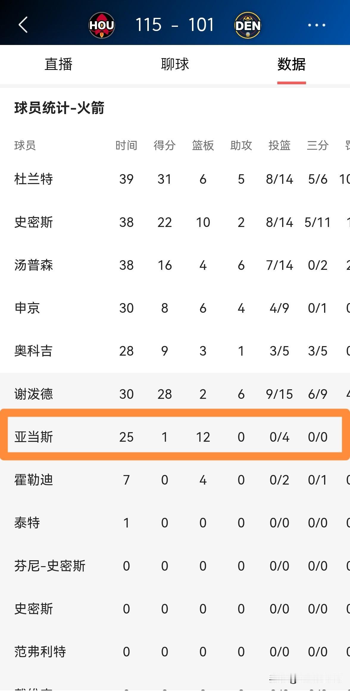 火箭老将亚当斯真是太让人惊奇了!在今天火箭客场以115:101击败掘金的比赛中,亚当斯打出了极其怪异的表现。全场比赛下来,亚当斯替补出战25分钟,投篮4中0仅仅依靠罚球得到1分,但是他抢到了12个篮板,其中包括5个前场篮板。 坦白说,放眼当今联盟,能够在一场比赛中得分少于前场篮板的球员,恐怕只有亚当斯了,亚当斯真是一个另类。