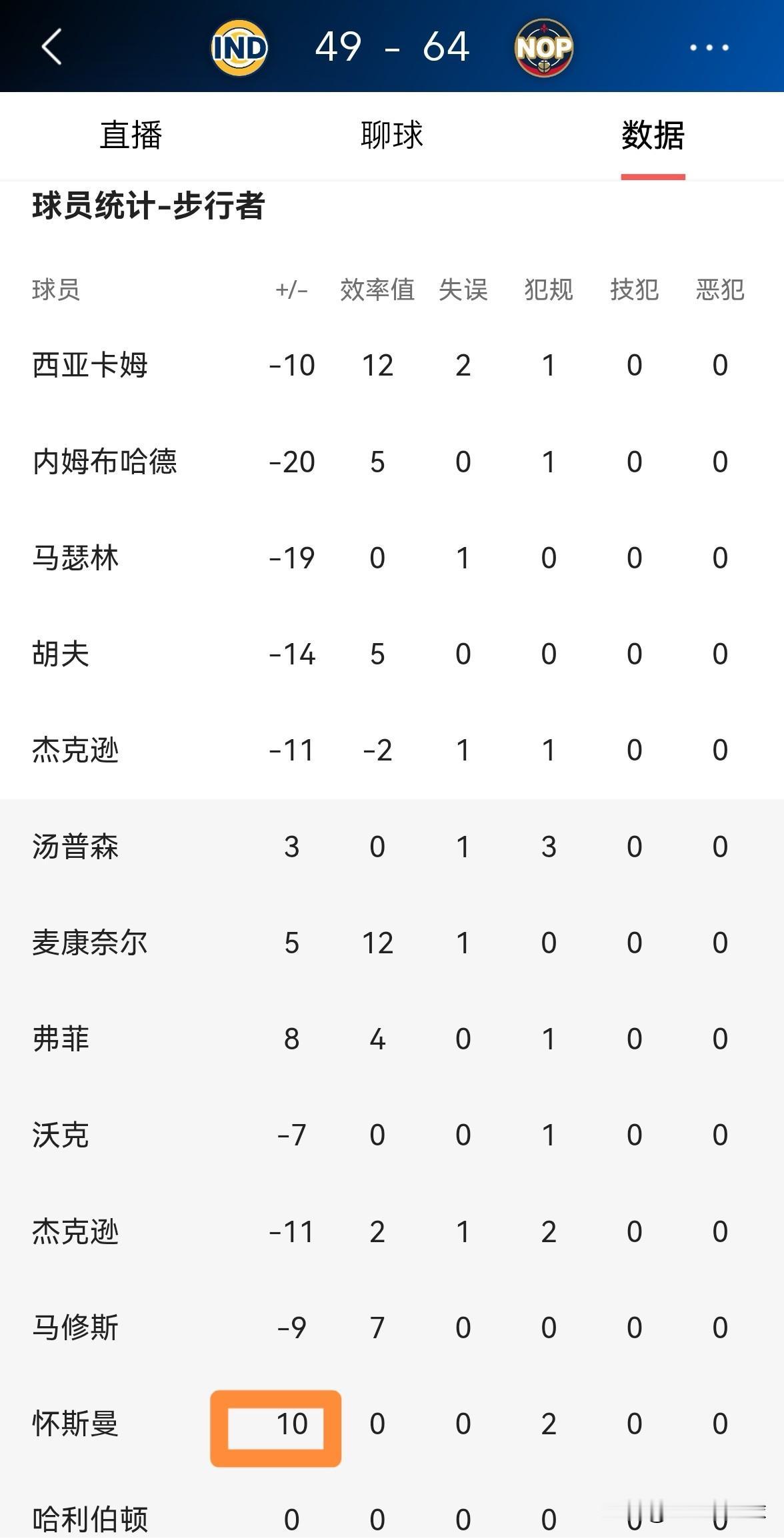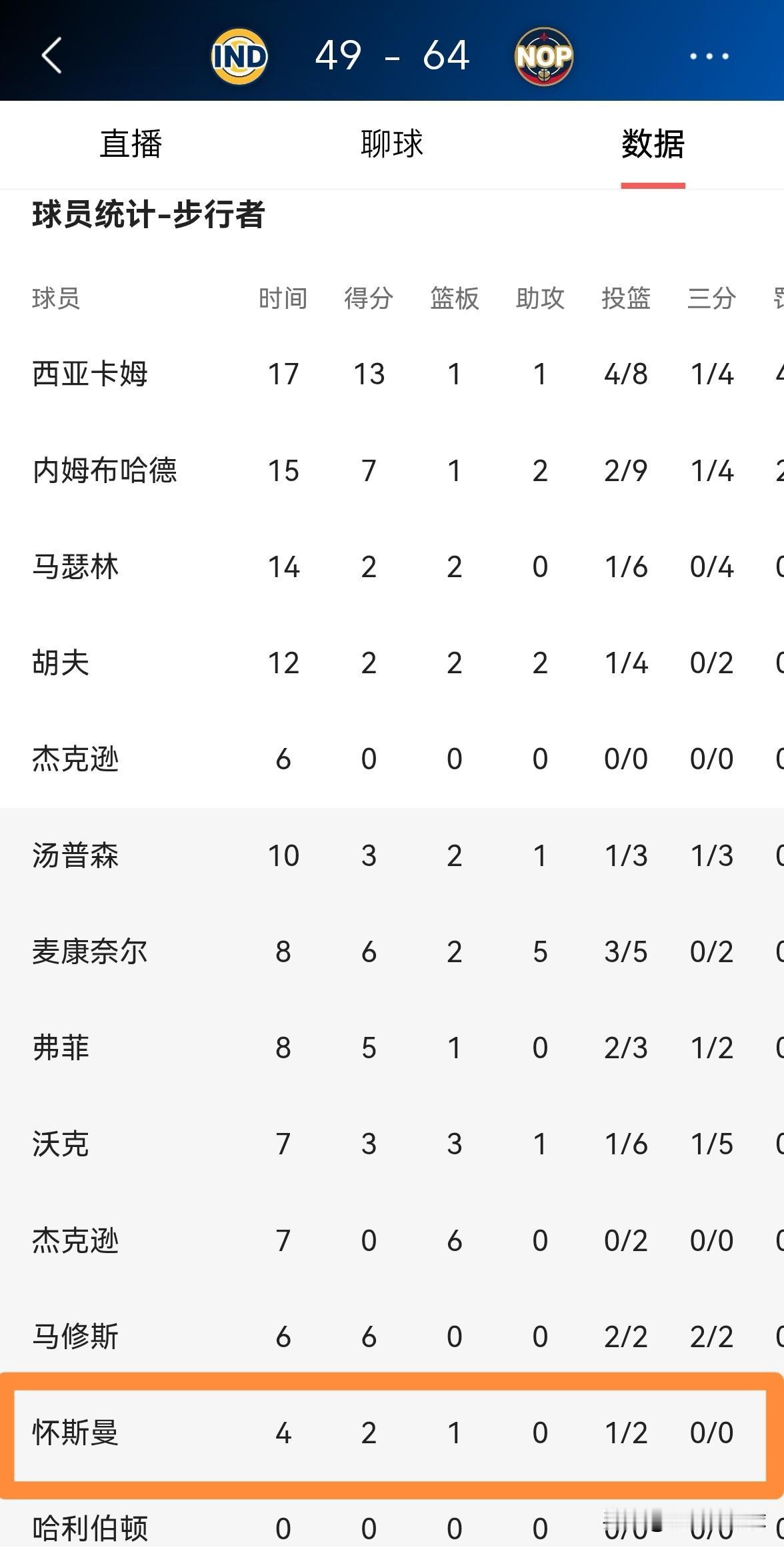 步行者新援怀斯曼真是太让人喜出望外了!在今天步行者客场挑战鹈鹕的比赛中,目前双方半场战罢,虽然步行者以49:64落后于对手,但是怀斯曼的表现却非常不错。 在前两节比赛中,怀斯曼替补出战4分钟,投篮2中1得到2分1篮板,他的场上正负值为全队最高的+10。 在怀斯曼替补上场以后,步行者的形势立刻发生了好转,球队在攻防两端重新焕发了活力。