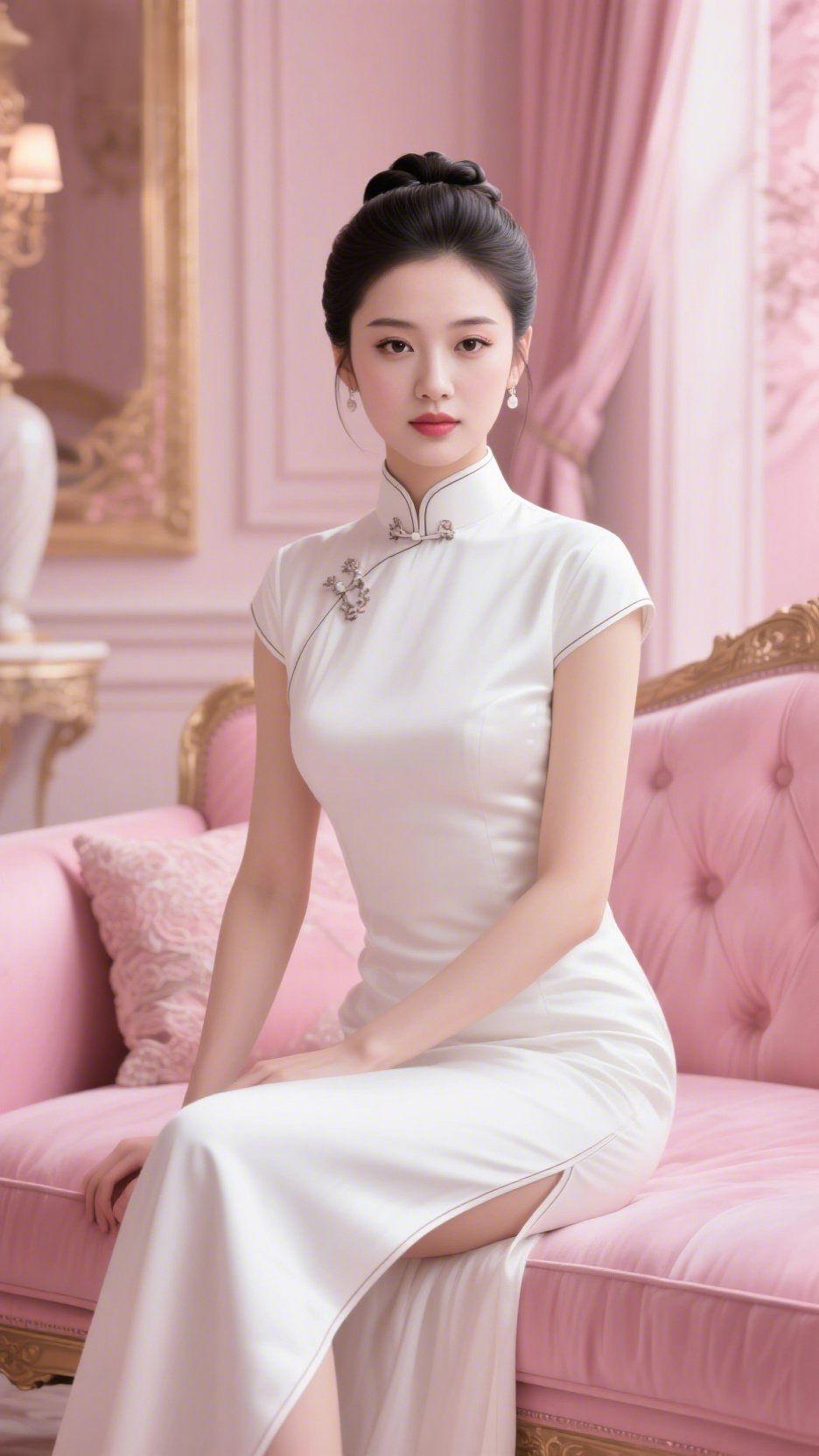 《雅室中的旗袍静美》 浅粉室间裹着柔暖的光,她静坐在绒榻旁,素白旗袍浸着缎面
