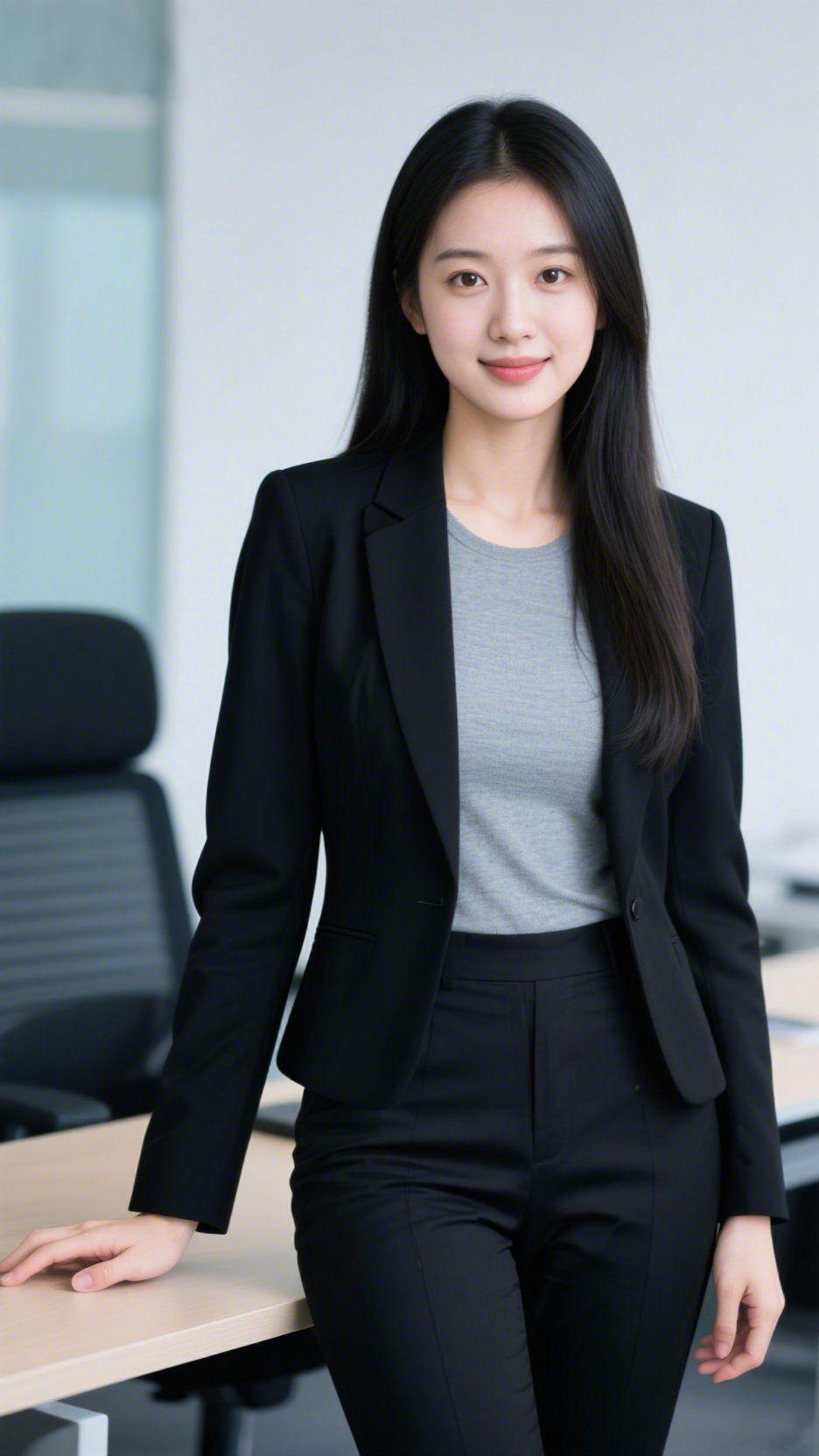 《办公间的从容底色》 浅光漫过办公室的桌沿,她立在那里,黑西装裹着妥帖的舒展,灰衫的软意揉进了利落的轮廓里。 指尖轻落桌面,长发垂肩的弧度里,是不慌不忙的温和——没有职场的冷硬,只把笃定藏在舒展的姿态里。这一幕像浸了暖意的纸页:是西装肩线的规整,是内搭面料的轻软,是忙碌间隙里自带的安稳气场。 她站在那里,不见刻意的锋芒,却让人心生共鸣:原来职场里的舒展,从不是凌厉,是这份从容又温和的模样。 职场从容温和感 通勤穿搭的妥帖