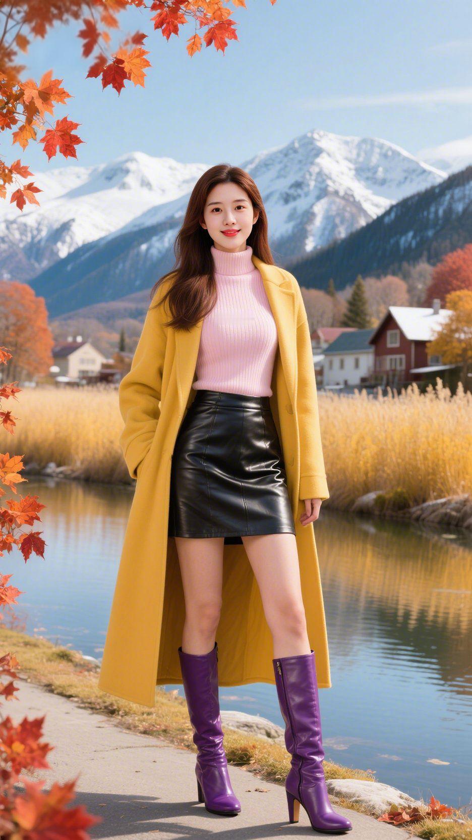 《秋湖旁的色彩柔风》 霜叶染红了岸,她立在湖畔,明黄大衣裹着浅粉的软,像把秋阳的暖揉进了衣褶里,紫靴轻踏的石径上,落着细碎的叶。 远山雪色衬着岸边的金芒,她的笑漫在风里——不是刻意的鲜亮,是秋与冬交界的温软。这一幕像浸了暖意的画:是大衣的舒展妥帖,是衣衫的轻软温和,是山野间漫开的鲜活气息。 她站在那里,不见多余的修饰,却让人心生舒展:原来最动人的,从来是这季节里,与湖山相融的明媚与轻柔。 秋湖旁的色彩温柔 季节穿搭的舒展