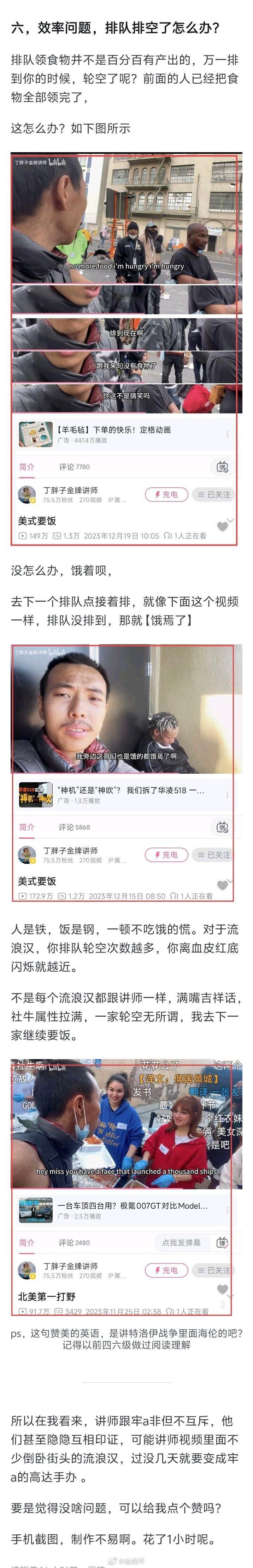 还有一点,金牌讲师出名后,经常有周边华人、留子来投喂,这是美国本土流浪汉所没有的
