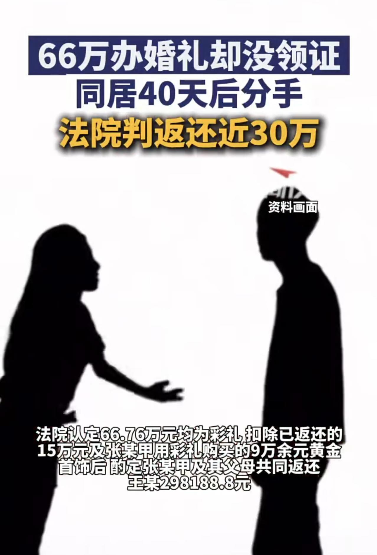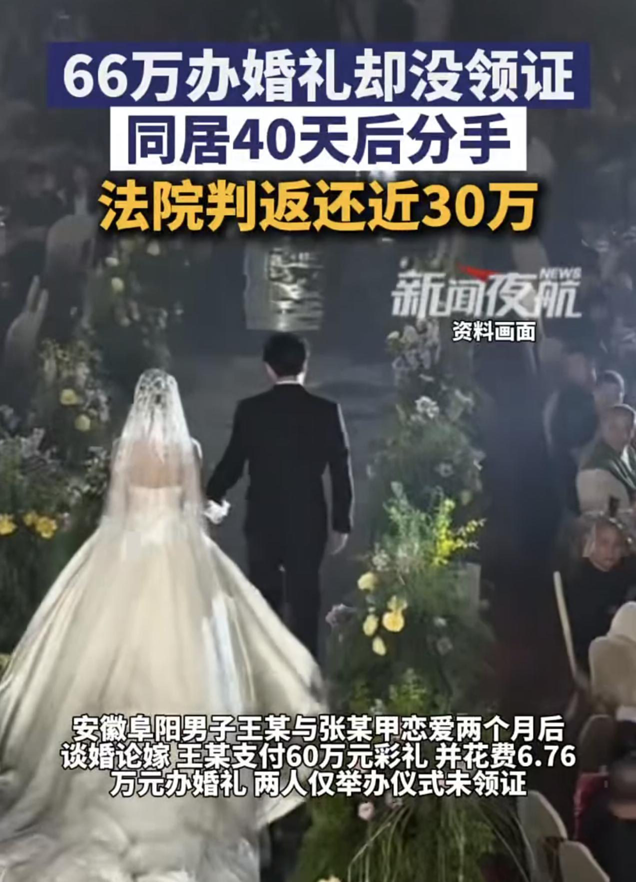 66万办婚礼没领证,同居40天分手女方共返还45万元!闪婚需警惕,风险确实不小! 事件起因 2024年9月安徽阜阳王某与张某甲恋爱两个月后谈婚论嫁,男方支付60万彩礼及习俗相关款项6.76万元,合计66.76万元;然而却仅办婚礼未领证 双方在同居期间,矛盾频发。张某甲返家离开,同居40天后二人分手。同居期间女方已返还15万,男方起诉要求再还43.74万;法院二审维持原判,判令女方及父母再返还298188.8元(剩余彩礼约69%)。 本案法律依据:适用《最高人民法院关于审理涉彩礼纠纷案件适用法律若干问题的规定》,未登记+共同生活短+彩礼过高,支持部分返还。 引发问题值得思考 闪婚风险大:两人恋爱两月办婚礼,感情基础薄弱,是矛盾主因。 彩礼异化:66万远超当地普通水平,易成家庭负担与纠纷导火索。 凭证缺失:一些地区彩礼多现金交付,取证难,影响纠纷处理效率。 给未婚男建议 总之,婚姻不是儿戏,谁赚钱都不容易。闪婚风险确实不小,要想彼此互相深入了解,还需要一定时间考验!高彩礼真的不提倡,把日子过好才是关键,难道不是吗? 信息来源:新闻夜航