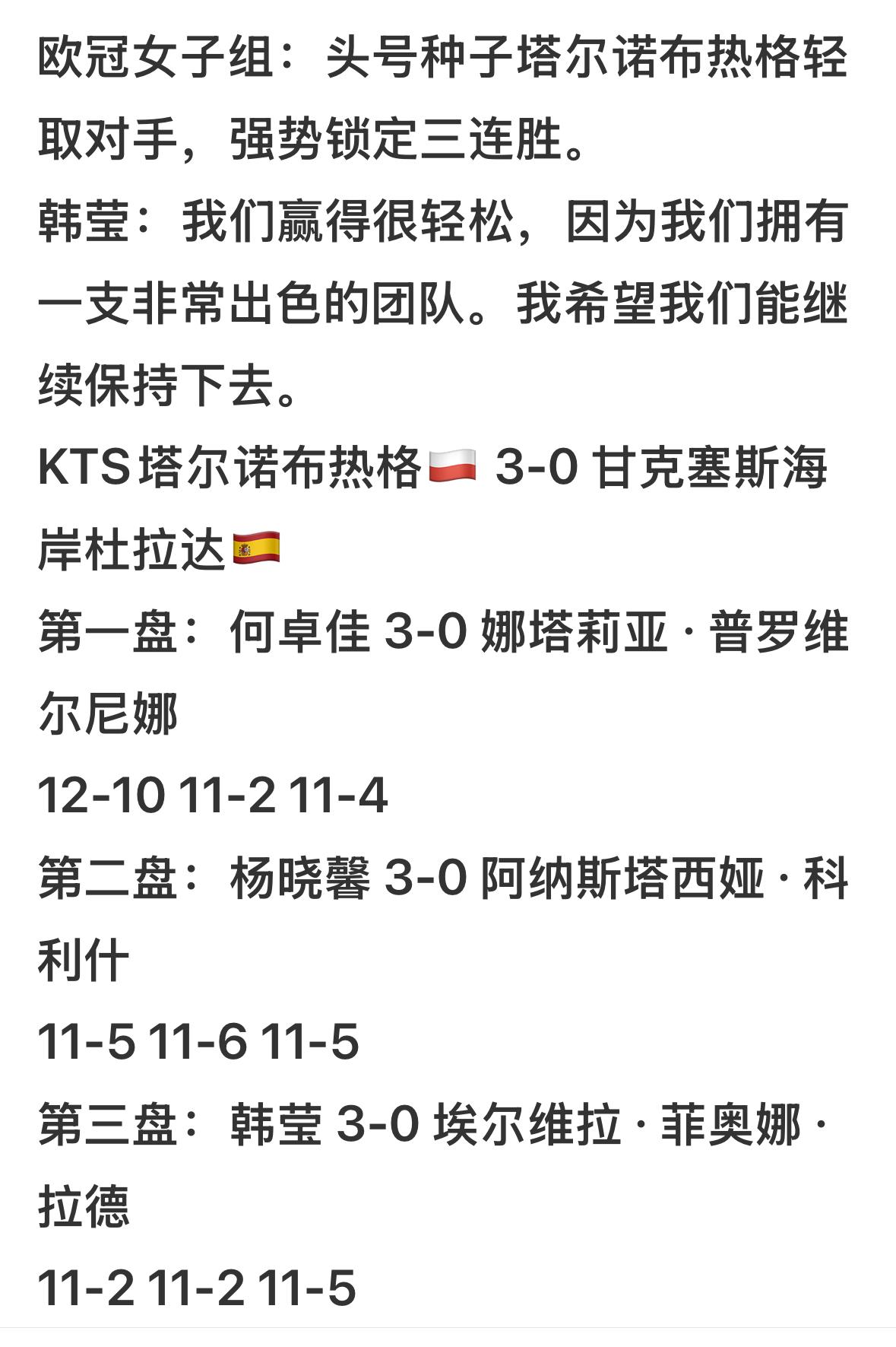欧冠联赛 何卓佳 韩莹 杨晓馨联手获胜 欧冠联赛这几天正在火热进行中, 何卓佳也非常辛苦, 满天飞, 刚从总决赛陪练回来, 就去打联赛, 过几天回来还要打乒超总决赛! 三个人,三块长胶, 真好,希望何卓佳也可以有 广阔光明的未来! 国乒选手目前都出去打欧冠, 德甲,法甲啦, 温瑞博,徐瑛彬, 陈垣宇,范思琦,刘炜珊…… 国内联赛希望也能越办越好, 给更多喜欢乒乓球运动者 更多的参赛机会, 就像闫安说的, 只要给机会,退役后的主播 都愿意打球,不赚钱都无所谓!
