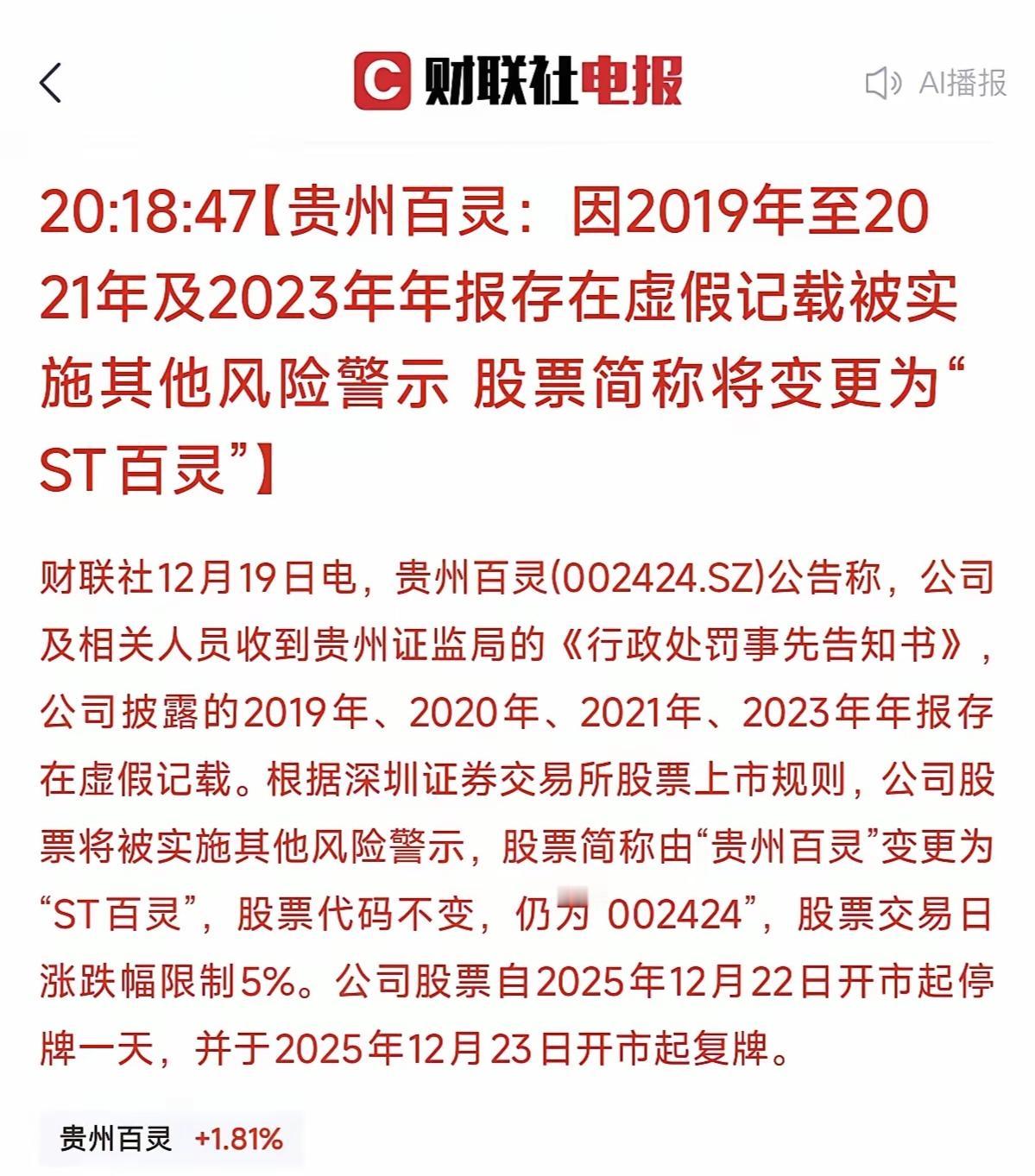 贵州百灵刚摘帽,现在又被戴帽了,并且连续4年财务造假,这种财务造假现象,在A股普遍存在,其实对于这种严重财务造假,连续财务造假的上市公司,就不应该搞什么ST,应该直接退市。退市该赔偿员工就赔偿员工,该赔偿投资者就赔偿投资者,既然财务造假都那么严重了,搞一个ST有什么用,继续在A股行骗吗。