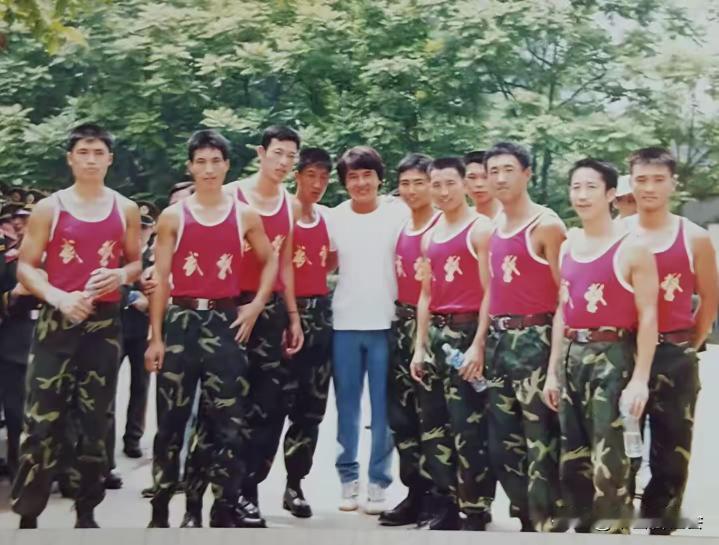 这是当年香港著名演员成龙在广州拍摄警匪电影《警察故事》3时和武警战士们在一起合影时的场景。 成龙作为电影的主演,对拍摄细节精益求精,他的《警察故事》系列电影,故事情节紧凑,曲折离奇,惊险刺激,是80年代香港电影黄金时期,最好的警匪电影之一。成龙老照片