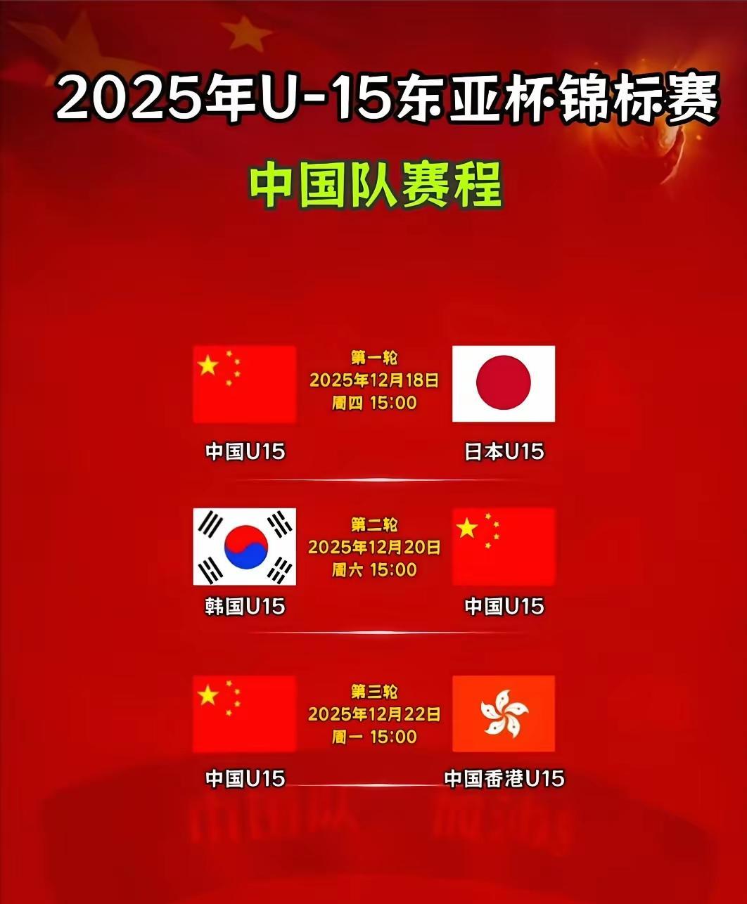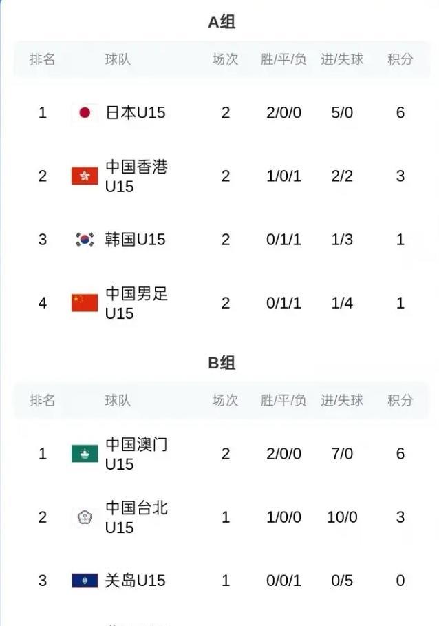 中国U15国少最后一场对中国香港U15成了真正“荣誉之战”了,中国队如果连香港省队都踢不赢就太没面子了,这让中国足协情何以堪,论前两场表现来看,中国香港U15表现真的更好,香港1胜1平积4分排名第二,香港赢韩国输日本,中国U15国少0比3完败日本,侥幸1比1逼平韩国,中国队积1分小组垫底,按中国U15国少的表现,想赢中国香港也不容易。 其实中国U15国少输中国香港更好,侥幸赢了也没用,这批中国U15选材真的很一般,下面必须扩大选材面,必须做到公平公正,物尽其用!中国足球加油!