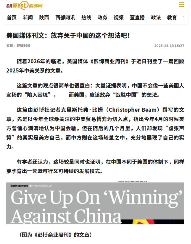 美国媒体直言:打不过,就放弃关于中国这个想法吧! 2026年越来越近,美国《彭博商业周刊》刊登了一篇回顾2025年中美关系的文章,里面说的都是实在话。 这篇文章的核心观点特别直白:别再痴心妄想中国会陷入困境了,美国压根赢不了中国,赶紧打消“战胜中国”的念头才是正理。 其实这个结论一点都不意外,只要看看2025年中美贸易掰手腕的全过程,谁在死撑、谁在说大话,明眼人一看就清楚。 2025年4月,美国那边狂得很,说要靠加关税把中国压服。特朗普政府把中国输美商品的关税从34%涨到145%,还喊着是“对等报复”,觉得这样一来中国出口就完了,企业就得倒闭。 不少美国政客也跟着起哄,说半年内中国准保求饶。结果呢?才过几个月,牛皮吹破了,自己先扛不住了。 最打脸的是美国汽车行业。本来美国政府以为加关税能保护本土车企,结果反倒坑了自己人。 像福特、通用这俩大家都知道的美国汽车巨头,2025年第二季度因为关税亏得一塌糊涂,福特亏了8亿,通用亏了11亿。 为啥会这样?因为美国车企看着是本土生产,其实一半以上零件都得进口,美国连进口钢铁、汽车零件都加了高额关税,生产成本一下就上去了,利润自然没了。 汽车行业惨,美国老百姓和整个国家经济也没好到哪去。加关税后,美股半个月就蒸发了4万亿美元,不少美国人的养老金都缩水了。 更直接的是物价飞涨,家电、药品全涨价,老百姓都忙着囤货。美国官方都警告,关税会让物价一直涨,就业也变难了。这就看出来了,美国想靠贸易战搞垮中国,结果先把自己的经济和老百姓坑了。 再看咱们中国,根本没像美国想的那样“扛不住”,反而稳稳地顶住了压力。美国把50多家中国高科技企业列进限制名单,想在芯片上卡咱们脖子。 但咱们早有准备,一边自己搞研发,一边精准反击。就说稀土吧,咱们限制了25种稀有金属出口,这些都是美国高科技、新能源产业离不开的,最后美国只能服软,把强硬禁令改成了“风险警告”。 贸易上咱们也没死磕美国,一方面对等加关税,让美国商品卖不动;另一方面多和其他国家做生意,减少对美国市场的依赖。 最后美国企业因为丢了中国这个大市场亏得太狠,逼着政府在日内瓦会谈上取消了91%的加税,咱们也跟着取消了反制关税。这就说明,中国的市场和实力摆在这,美国想打压根本不现实。 至于美国说的“制造业回流”,更是白日做梦。加关税没让外国企业去美国建厂,反而让美国制造业成本涨了不少,不少工厂倒闭、工人失业。 就算像苹果这样说要追加1000亿美元投资美国制造业,也没说把iPhone全放美国生产,说白了就是不敢丢了中国市场和全球供应链。 说白了,2025年的贸易较劲,把美国的吹牛和中国的实力看得明明白白。美国一开始气势汹汹,最后亏的是自己人;中国没被压垮,反而更有韧性。 《彭博商业周刊》让美国放弃“战胜中国”的想法,不是帮咱们说话,是看清了现实——现在的中国早不是以前了,有底气保护自己的利益,美国想打压根本是做梦。 全球范围内,合作才能共赢,搞对抗最后只会两败俱伤。美国要是真为自己国民着想,就该早点放弃不切实际的幻想,好好和中国谈合作。 要是还抱着“战胜中国”的念头不放,最后只会搬起石头砸自己的脚,被世界潮流甩在后面。这一点,美国媒体都看明白了,希望美国政客能早点清醒。