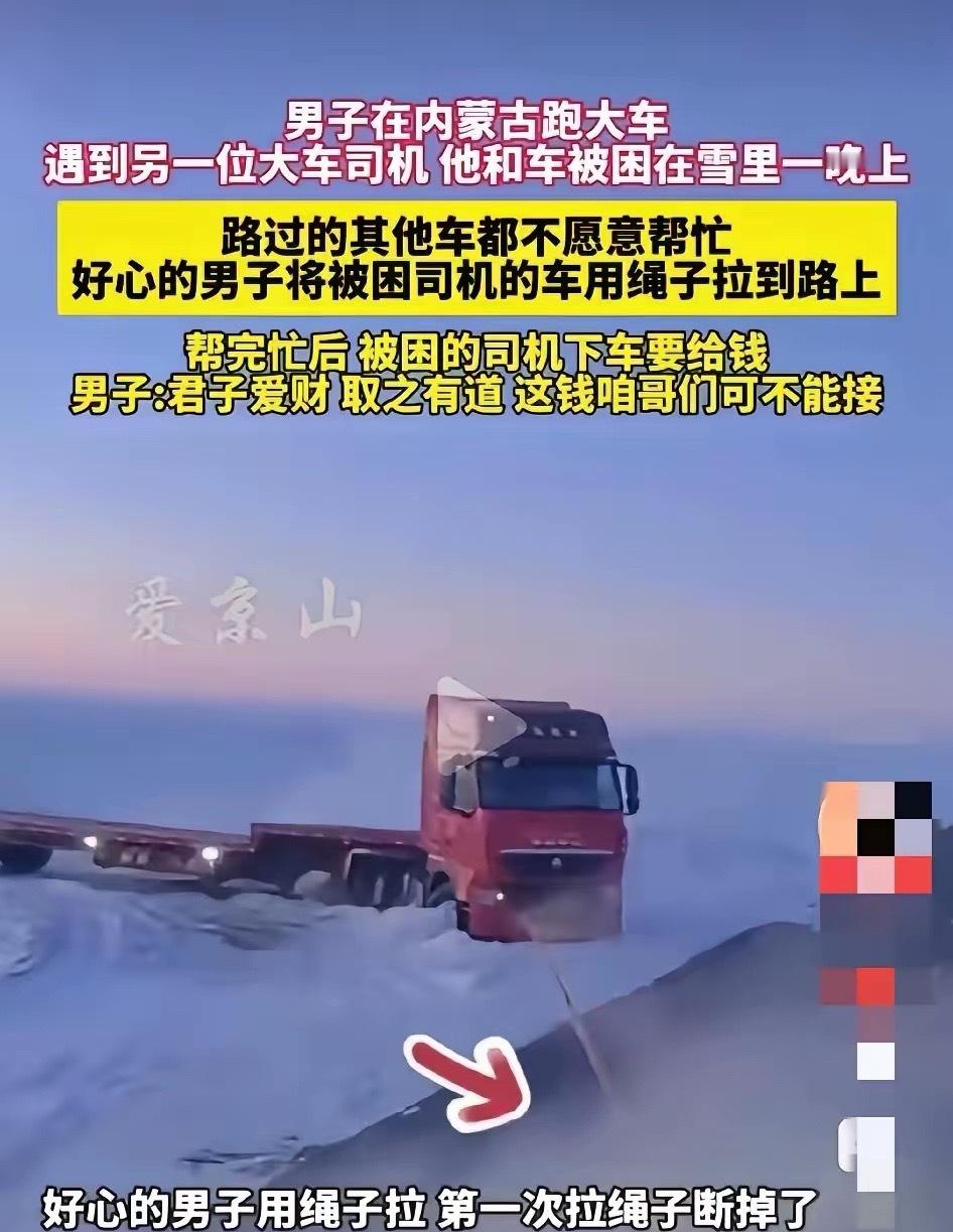 男子在内蒙古跑大车,半路上看到一部大货车困在雪地里,上前一问得知,该车司机和他的车子已经在雪地里困了一晚上了,当时的气温是零下20多度。当时也有人路过这里,他也向路人求救了,可是没有人愿意帮他,男子听到这里主动提出他愿意尝试一下。那司机见到他,嘴唇冻的说话都打颤,眼眶突然就红了。兄弟我以为要等救援车来收尸呢,他指着车轮下的积雪,昨晚后半夜起的暴风雪,车子陷进雪窝就没挪动过,裹着三件棉衣都冻得牙齿打鼓。跑大车的都懂,零下20多度的寒夜,在空旷的国道上被困,可不是小事——油箱可能结冰,刹车会失灵,长时间低温还可能引发冻伤,那就危险了。他没多废话,转身爬上自己的车,拿出拖车绳麻利地绑在两辆车的挂钩上。你挂低速挡,我拉的时候你跟着给点油,他朝对方喊了一声,发动机轰鸣着启动,车轮在雪地里碾出两道深痕。第一次拖拽绳子都被拉断了也没拉出来,他心里清楚,要是硬拉,说不定两辆车都得陷进去。他跳下车,踩着积雪绕到被困货车后面,用铁锹一点点铲掉车轮周围的硬冰,又从车厢里翻出备用的防滑链,蹲在雪地里忙活了十几分钟,手都冻得通红。第二次拖拽时,他调整了角度让两辆车保持在同一直线上,随着一声闷响,被困货车的车轮终于缓缓转动起来,一点点驶出了雪窝。那司机跟着车子往前开,高兴的都流眼泪了。兄弟,你救了我一命啊,车子停稳后,他塞给对方一沓现金,被他笑着推了回去。出门在外,互相搭把手不是应该的?他擦了擦脸上的汗水,下次遇到别人有难处,你也伸手帮一把,这情分就传下去了。其实在跑大车里没有那么多冷漠的算计更多的是同是天涯沦落人的共情。那些穿梭在风雪里的货车,承载的不只是货物,还有每个家庭的期盼。路人的犹豫或许有现实的考量,但真正的善意,从来都不是权衡利弊后的选择,而是发自内心的不忍。零下20度的严寒里,那根紧绷的拖车绳,拉出来的不只是一辆被困的货车,还有人与人之间最珍贵的信任与温暖。往后再遇到这样的场景,希望更多人能停下脚步,你的一次伸手可能就是别人的绝境逢生的希望。