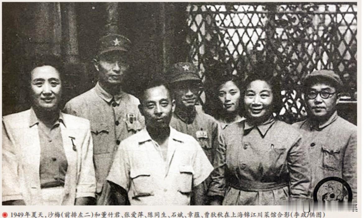 1949年夏天,上海解放后不久,锦江饭店创始人董竹君与张爱萍、陈同生、章蕴、曹荻秋、石斌(曹荻秋夫人)、沙梅等新四军老同志在锦江川菜馆的珍贵聚会。 锦江川菜馆由董竹君于1935年3月15日在上海法租界华格臬路(现宁海西路)创办。开业之初便门庭若市,上海滩头面人物都是常客。1936年,董竹君又在华龙路(今雁荡路)开设锦江茶室,这里成为地下党和进步人士的秘密联络点。 1951年,董竹君将锦江川菜馆和锦江茶室合并,迁入华懋公寓,成立了新中国第一家国宾馆——锦江饭店,将价值15万美元的资产全部奉献给国家。