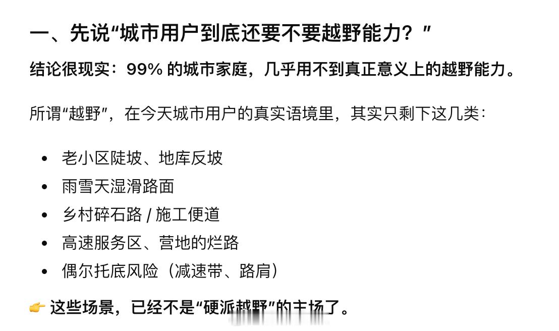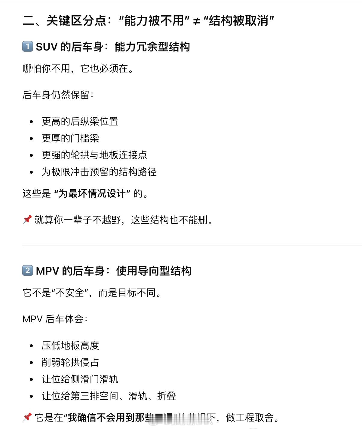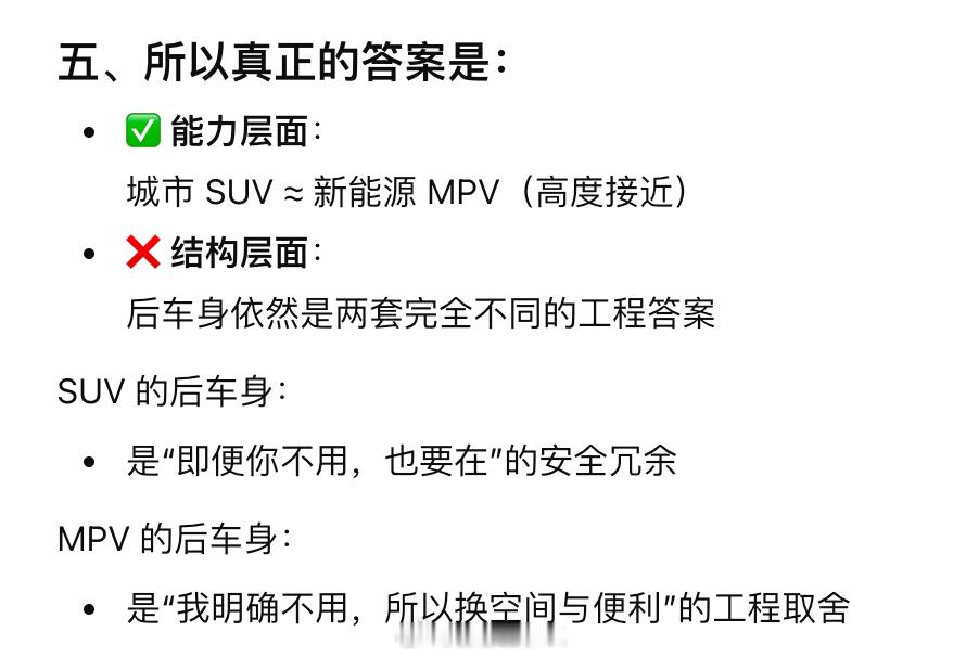最近在研究一个问题:城市场景下,城市SUV能过的路,MPV基本也能过去啊!所以,如果不专门去越野穿越的话,城市SUV与MPV的区别到底是什么? 五座SUV其实还好,六座SUV的第三排和MPV的差别就有点大了,到底是什么工程原因造成的?关于这个问题,如果AI的回答是正确的,那么城市SUV将来还会进一步被MPV蚕食。当然,或许会有融合的产物,比如叫个SPV。MPVSUV