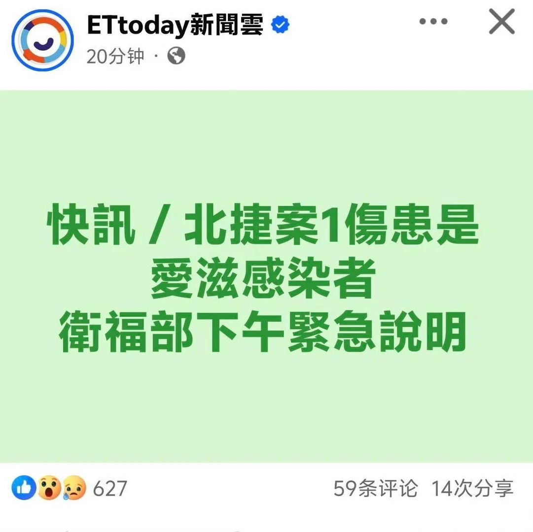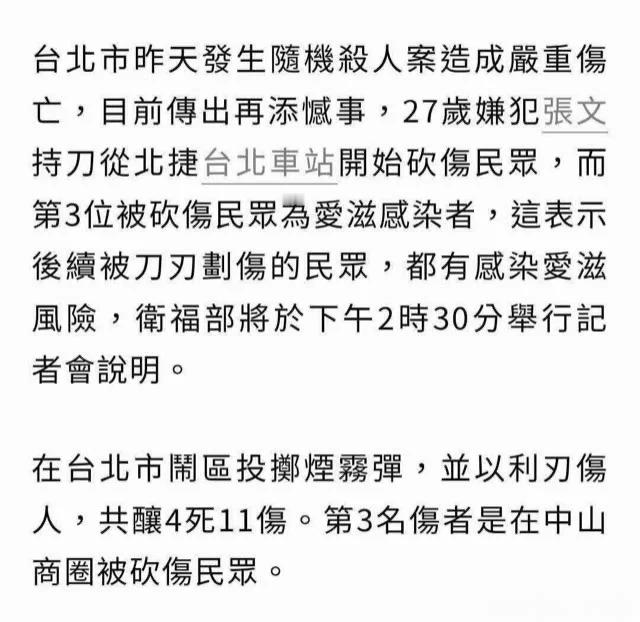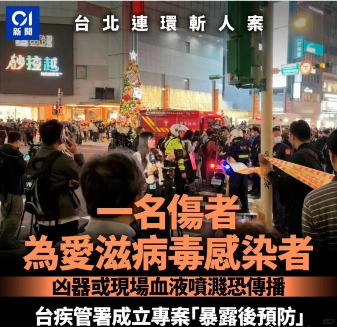 台北艾滋病伤者在长期服药稳定控制据台媒报道,台卫生福利部门今日(12月20日)临时召开记者会说明,其中一名被砍伤民众为艾滋病感染者,系第三位被砍伤群众,该名伤者长期有在服药稳定控制,属于测不到的范围。不过仍提醒有接触到血液或喷溅到黏膜的民众,于72小时内尽速前往医院。据台北市消防部门、警察部门此前消息,27岁的张姓行凶者在12月19日下午5点半左右,在台北车站丢掷烟雾弹,并持刀砍人,造成两人受伤。随后前往捷运中山站路面,丢掷了多枚烟雾弹;随后持刀闯进诚品南西店,沿途砍伤了多名路人。男子进入商场后,登上相当于六层楼高度的楼顶,在警察围堵下跳楼,送往医院急救无效,于晚间7点42分不治身亡。