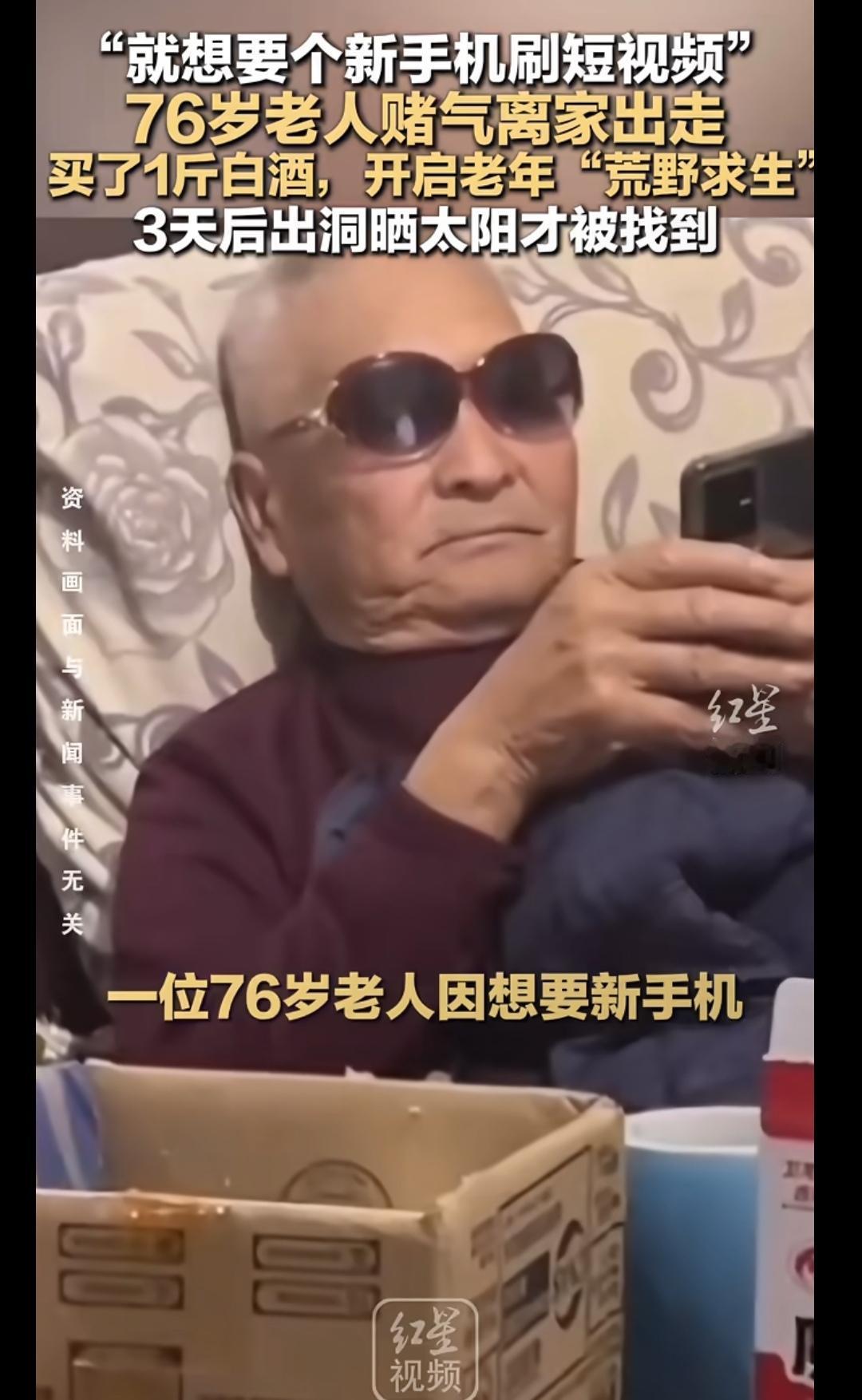 这大爷的叛逆期来的有点晚啊!76岁赌气还离家出走,因不给买新手机刷短视频,买了一斤白酒躲起来了,三天后出来晒太阳被找到了!其实吧,给老人手机刷视频挺好的,怕诈骗你就不要给他安手机卡,家里搞个WiFi,老人这点爱好能满足就满足一下吧!毕竟这么大年纪了,就当尽孝心了,还能有几年活头呢?大家觉得我说的在理吗?